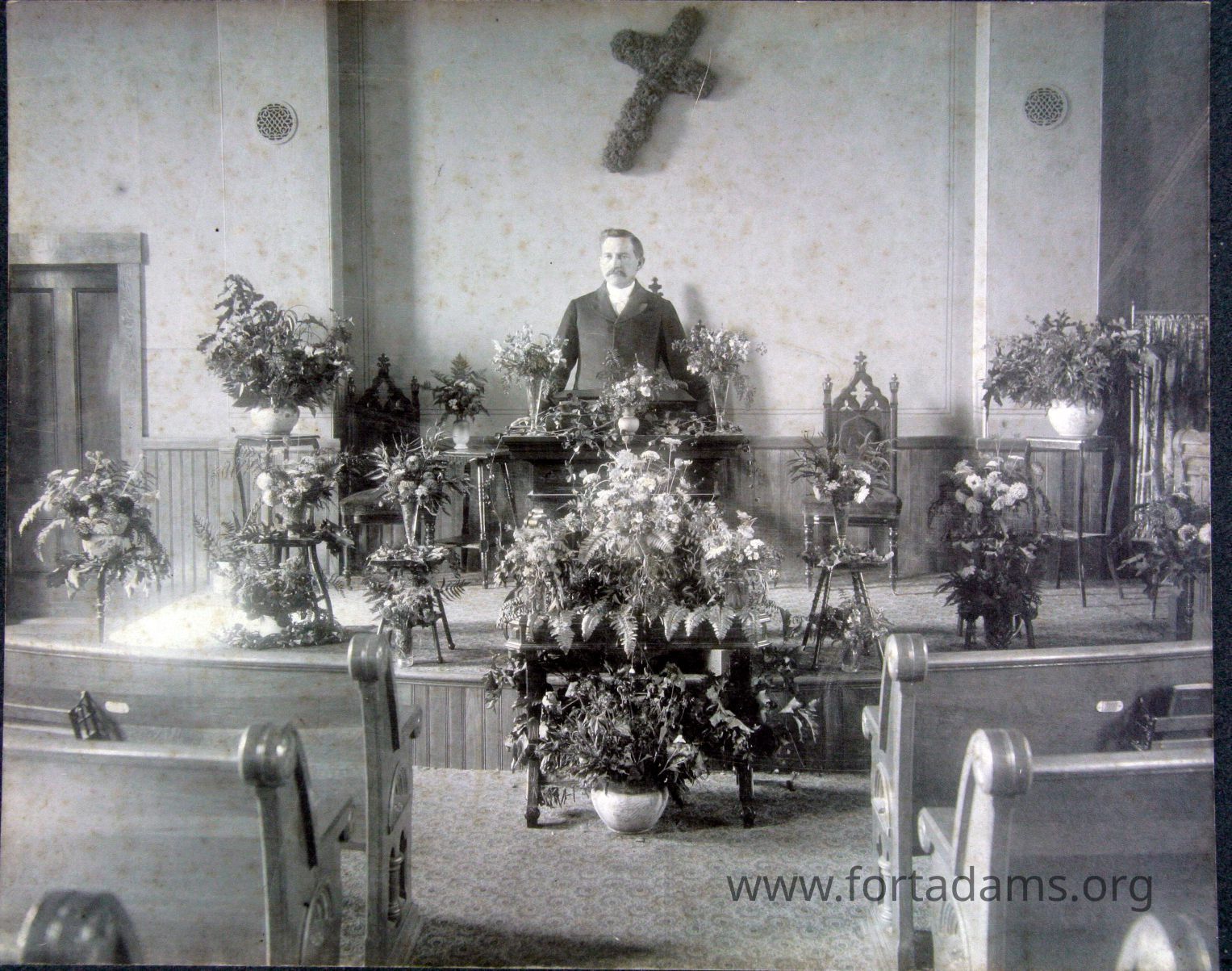 Man standing on church platform in front of pews; 15 floral arrangements