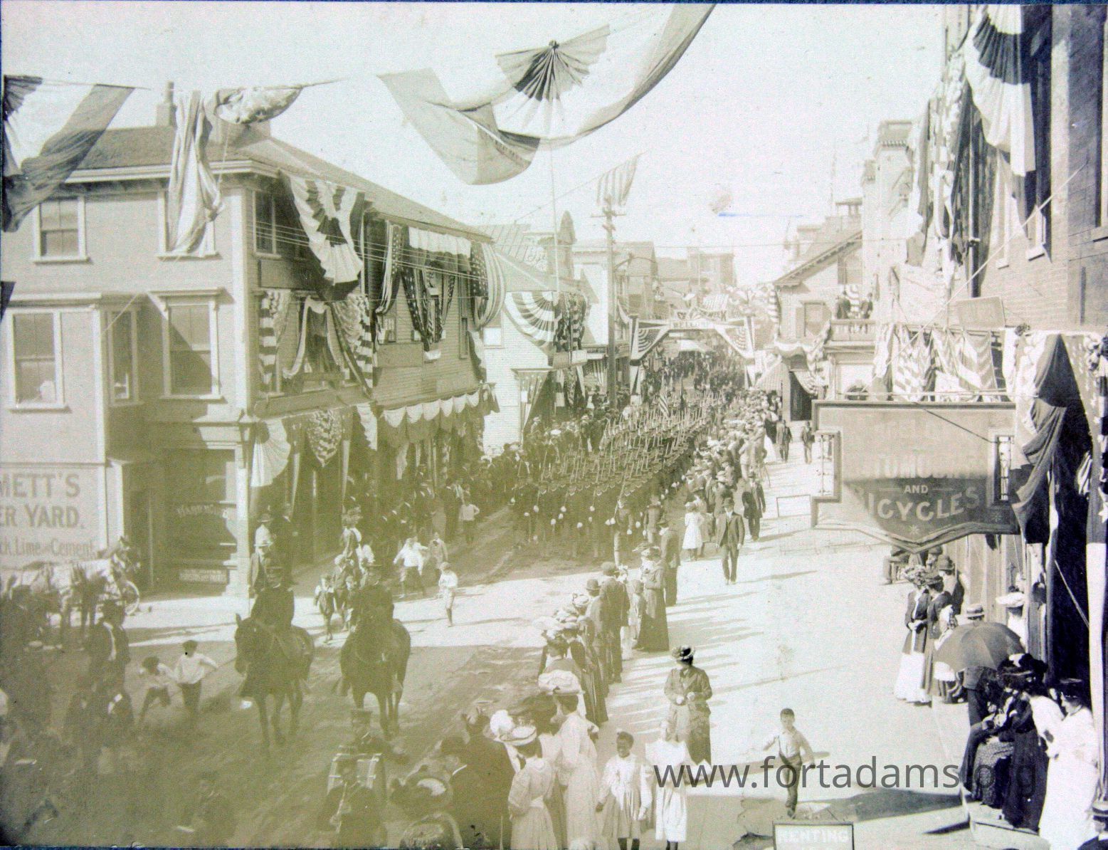 "the Army Parade in Newport Old Home Week 79th Co. C.A. at the head of the coloumn" (sic)
