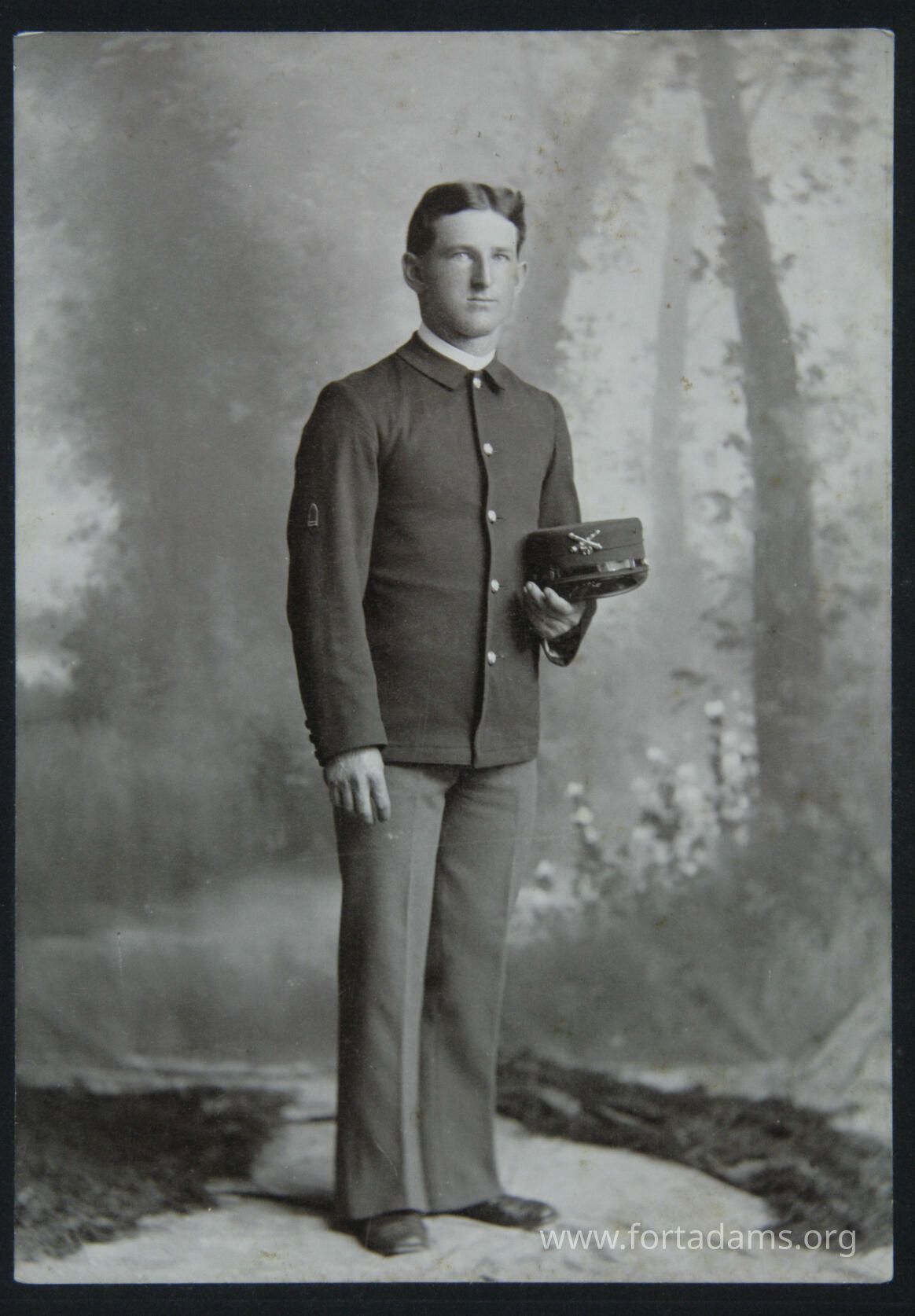 Portrait, male, standing full figure, wearing uniform holding hat