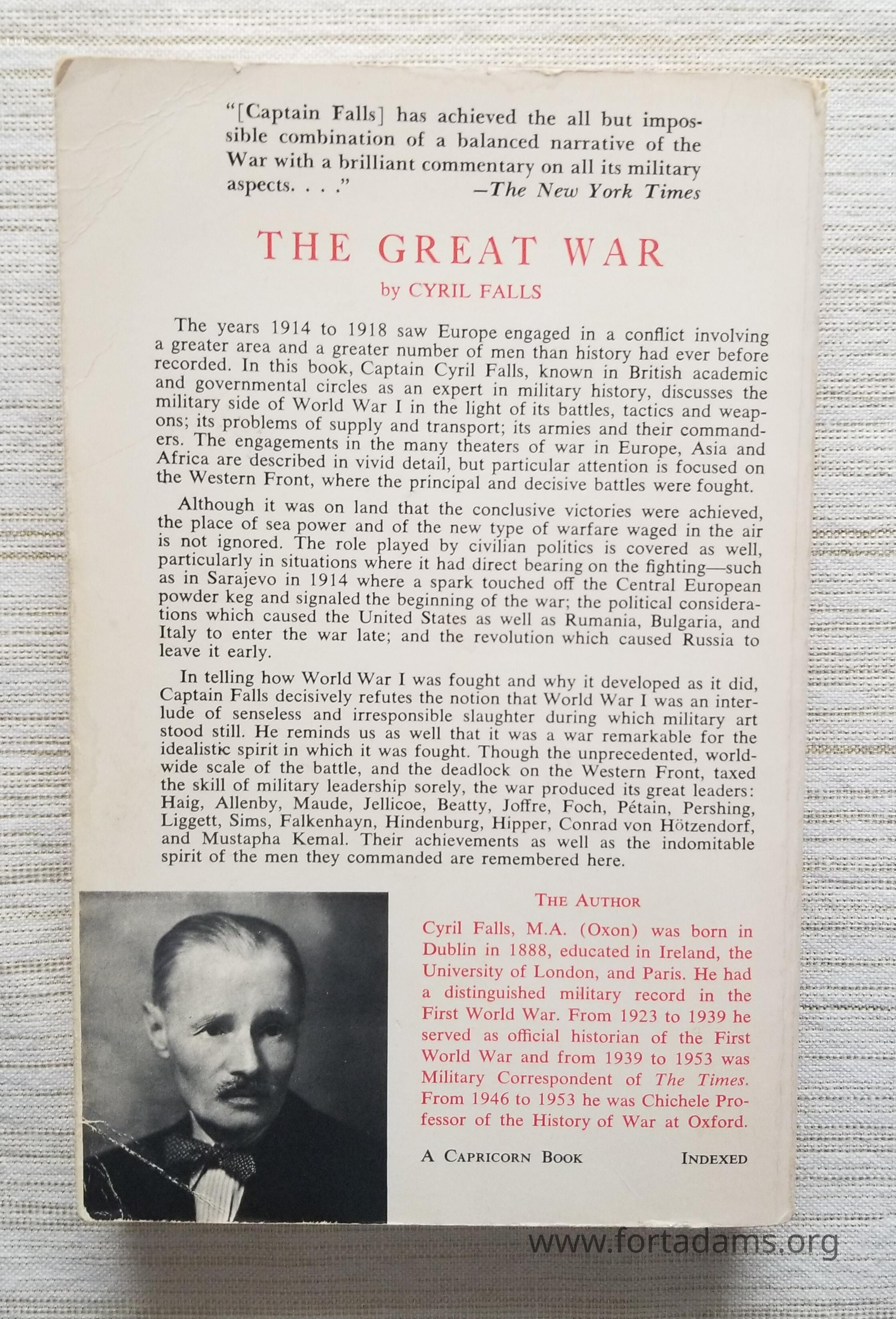 Author Falls discusses the military side of WWI in the light of the battles, tactics, and weapons; its problems of supply and transport; its armies and their commanders. The engagements in the many theaters of the war in Europe, Asia, and Africa are described in vivid detail, but particular attention is focused on the Western Front, where the principal and decisive battles were fought and as it happened, where the English-speaking people played a major role.