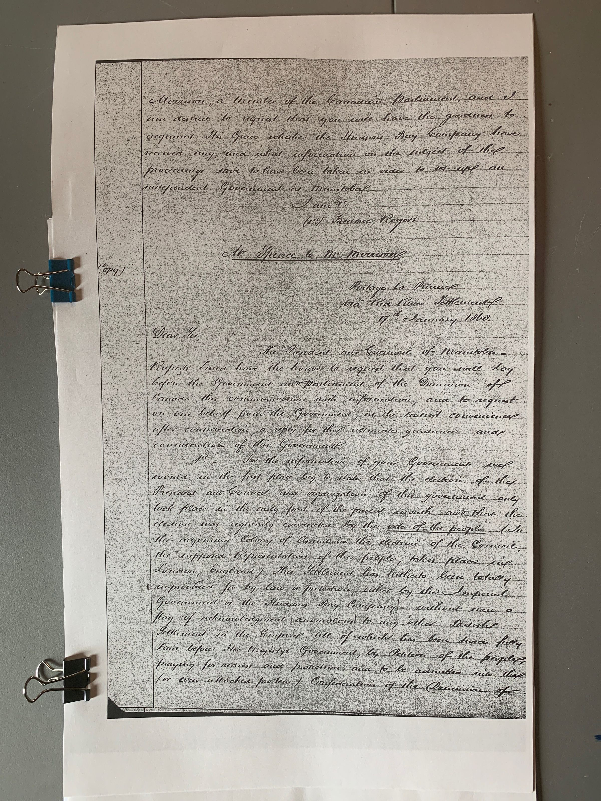 Copies of two letters sent by Thomas Spence in 1868 requesting the recognition of the Republic of Manitobah