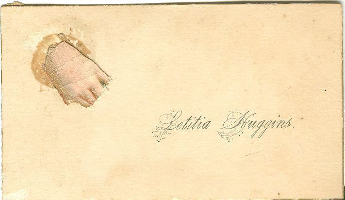 Calling card once owned by Letitia Huggins. The card is 3 1/2 x 2 in with a gold straight edge. The card is made of heavy buff paper. The name "Letitia Higgins" is printed on the card in black in a script style. On the upper left of the card, there is a die-cut hand attached that appears to have been torn around the wrist and across the fingers. According to donor information, the card came from a scrapbook that belonged to Catherine McLeod Mounts.