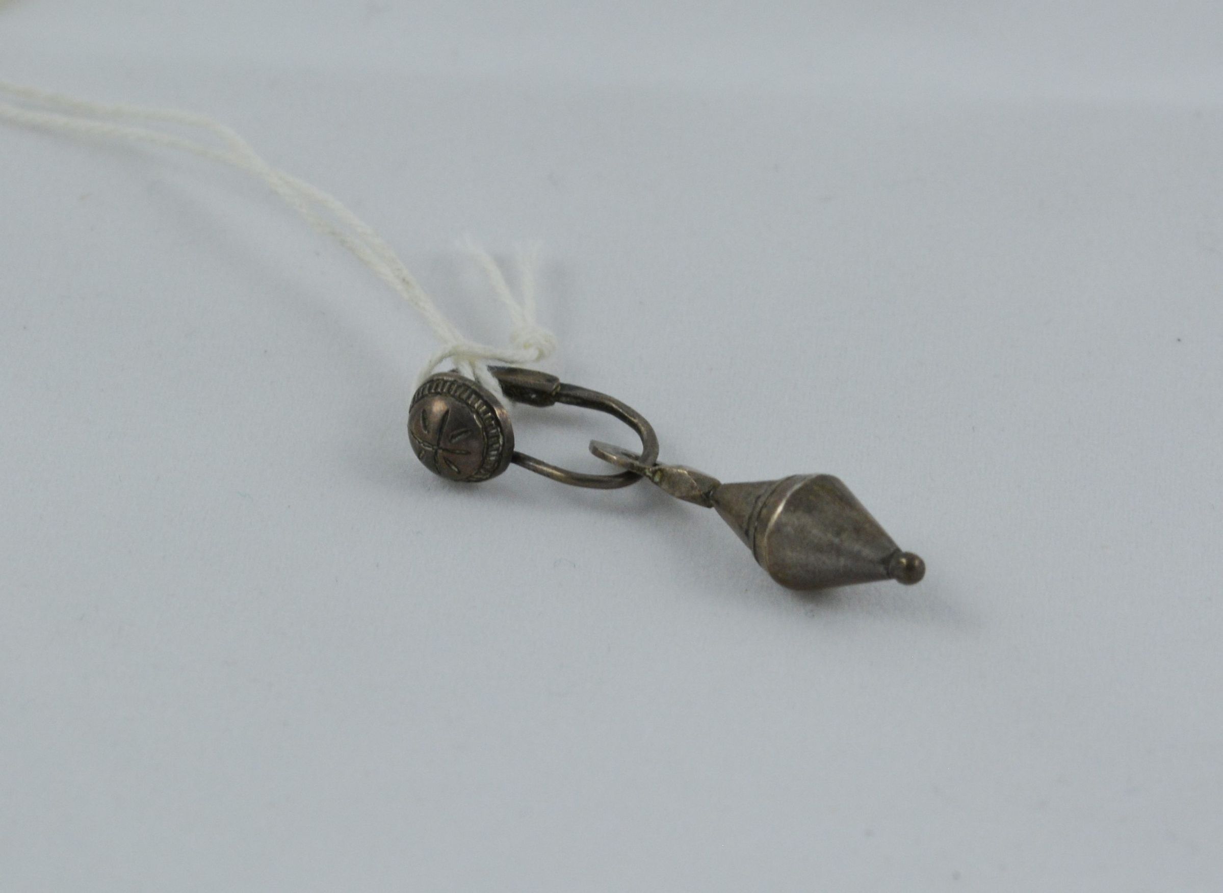 Earring belonging to Mary McLeod, wife of HBC laborer John McLeod. Mary was born in 1827/1828 as "Claquadote (T'Laquodete)" into the Cowlitz Tribe. She married John McLeod around 1844 and died in April of 1889. The earring has a top hinged piece with a circle with small line design stamped into it. There is a drop portion that hangs from the hinged piece that has a hammered upper cone shape, and a lower smooth upside-down cone chape with a small ball-point at the very tip. The earring is made of some sort of silver alloy and is 1 1/2 inches total in length. The top portion only measures 11/16 inches and the drop piece measures 1 1/16 inches.