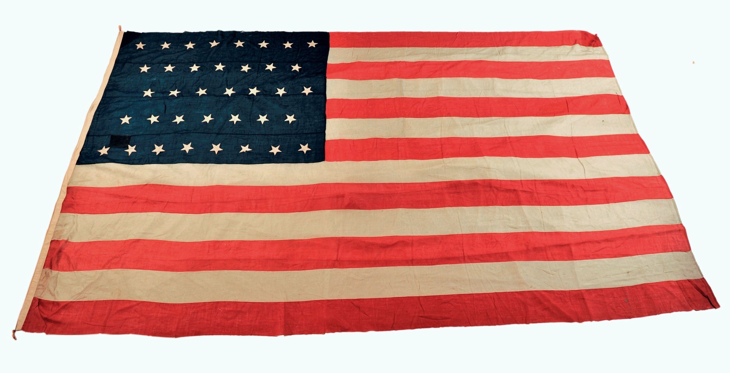 American flag with 37 stars, belonged to the Thomas Huggins, son of Edward Huggins, last British clerk in charge at Fort Nisqually. The flag has 37 stars and dates between 1867-1877. The Huggins family's use of an American flag is documented in an 1896 photograph from the WSHS collection. Measures 20 feet long.