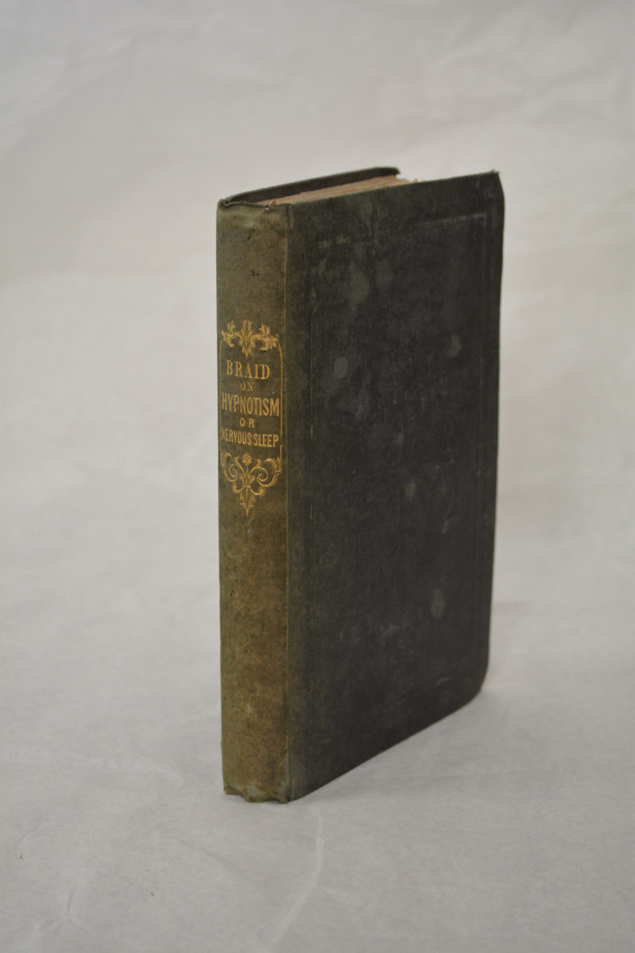 Book owned by Dr. William Fraser Tolmie during his time at Fort Nisqually: "Neurypnology: Rationale of Nervous Sleep" by James Braid. The spine reads "Braid on Hypnotism or Nervous Sleep". Title page reads "Neurypnology; or the Rationale of Nervouse Sleep, considered in relation with Animal Magnetism." 265 pages long including index, plus two other pages of ads for more books by the same publisher. Measures 6 7/8 inches tall, 4 3/8 inches long, and 3/4 inches wide. Cloth bound. Published by John Churchill in London, 1843. Signed and dated by Tolmie on the title page, 1844.Dimensions
