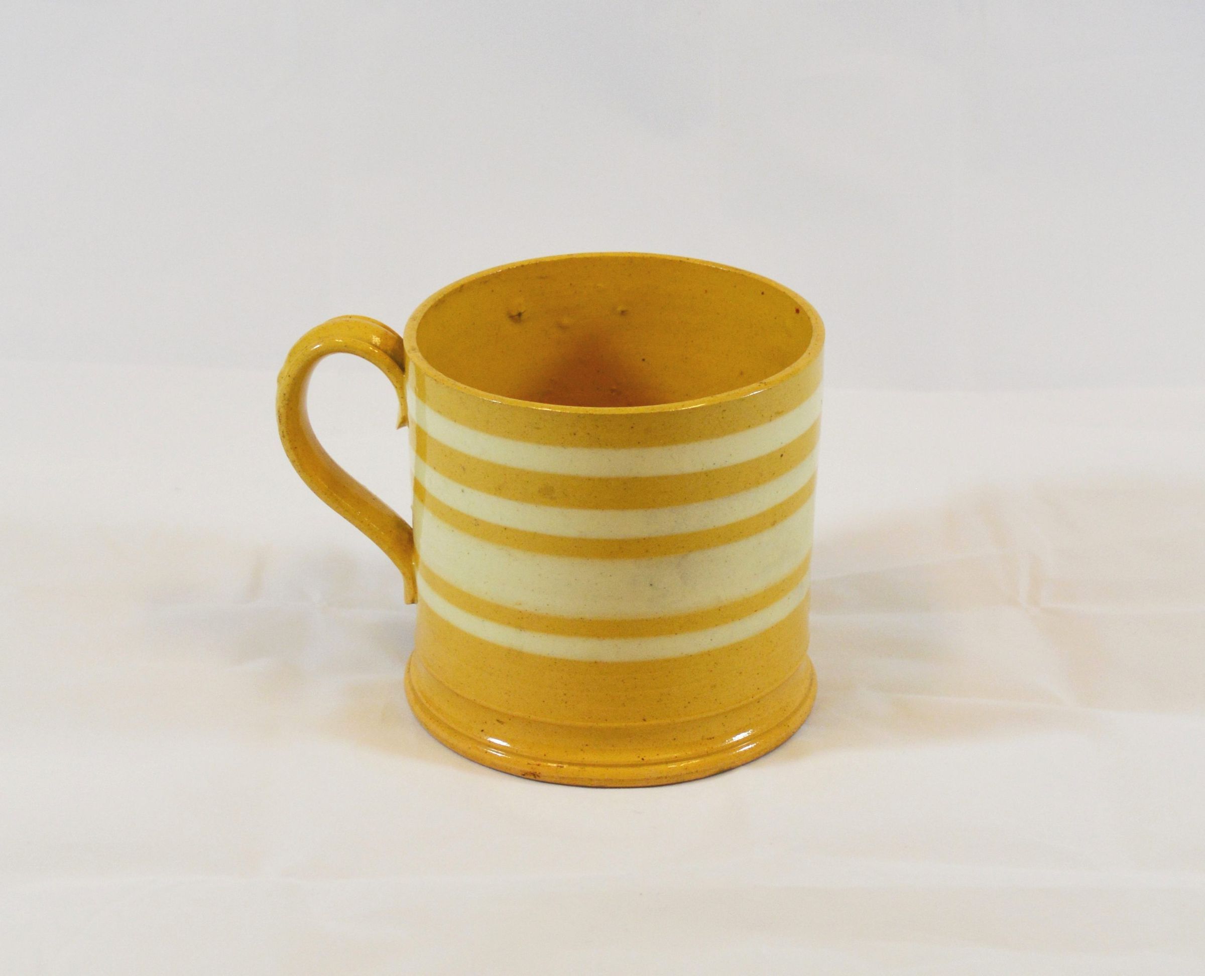 A "banded" mochaware or yellow-ware mug, named because of its coloring: yellow with white or brown bands. This mug has only white rings of varying widths. The mug measures 4 7/8 inches in diameter across mouth opening, and 4 3/4 inches tall. This style of mug was very common among clerks and the laboring class and were used primarily for malt beverages, but very few have survived undamaged.