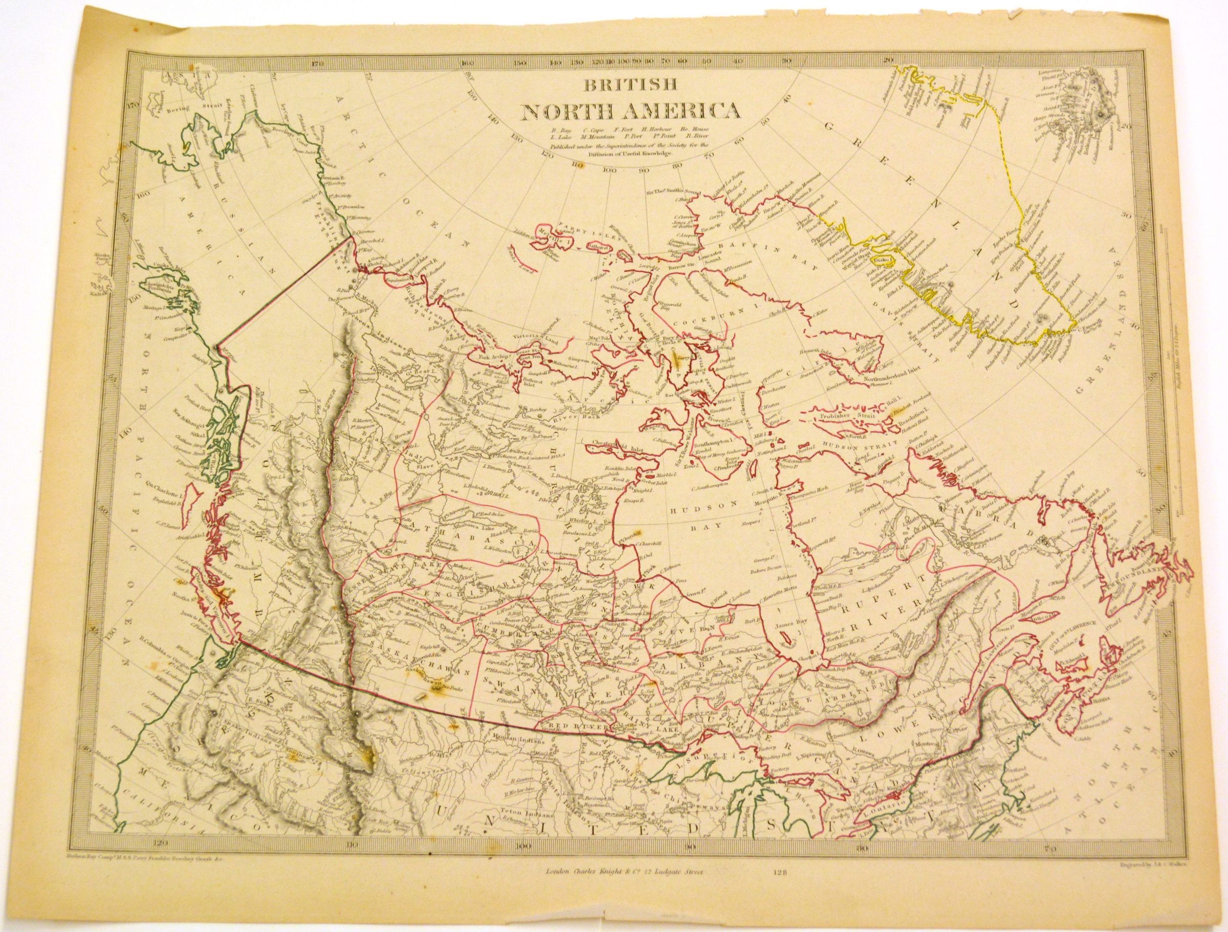 Map of British North America c. 1850. The map illustrates the northern United States up through Alaska and the Arctic Ocean, including Greenland and Iceland. British territories are outlined in red, Alaska, labeled "Russian America," and the United States territories are outlined in green, Greenland is outlined in yellow, and Iceland is simply black and white. Engraved by J.&C. Walker, published London, Charles Knight and Co., 22 Ludgate Street. Map is a page torn from a book, measures 16 3/4 inches by 13 3/4 inches.Dimensions