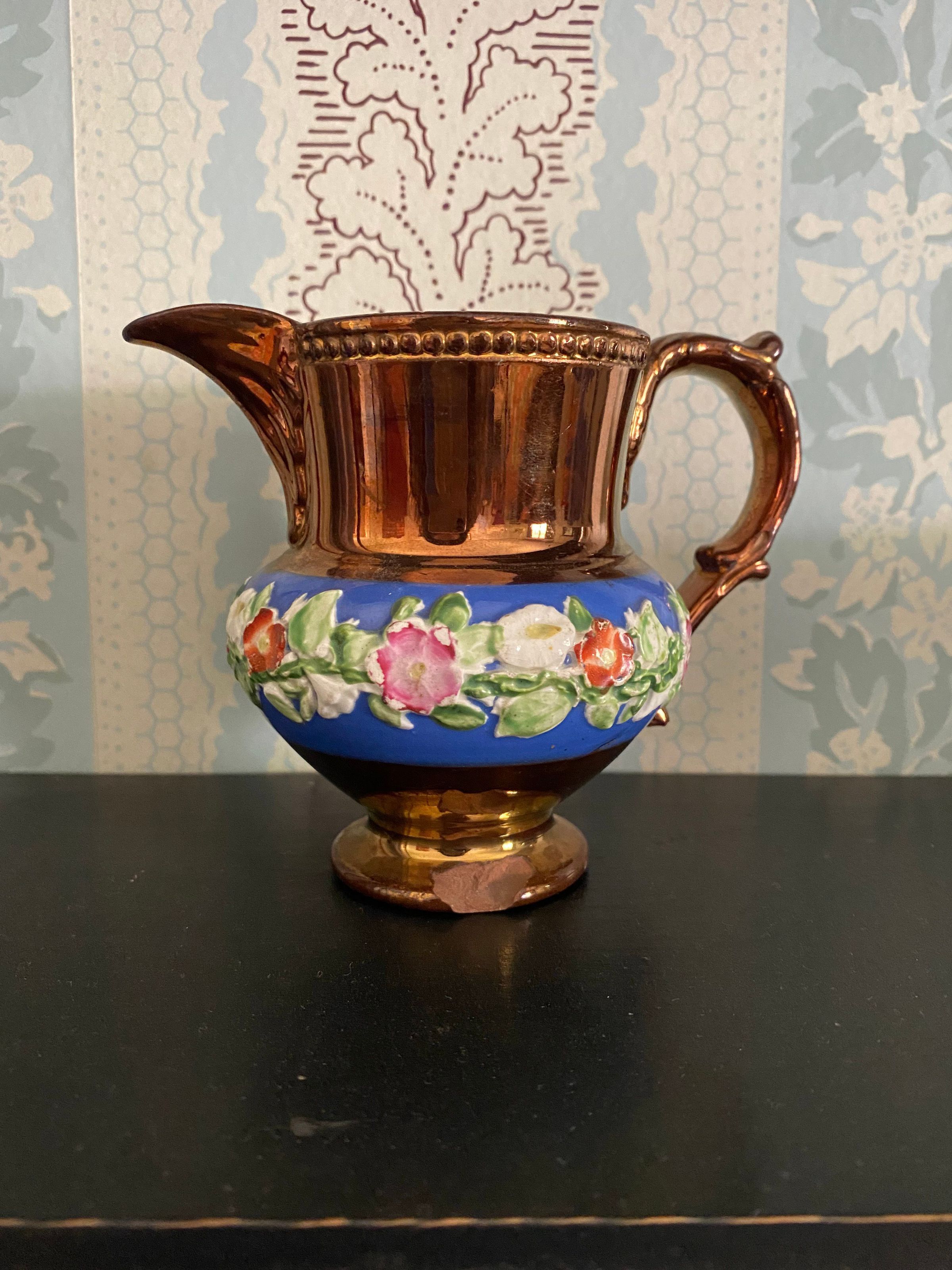 Lustreware pitcher, bronze colored with blue decorative flower band around middle. Base is slightly scuffed, and there is one large chip out of it. Measures 4 inches tall, 3 1/4 inches wide at center, 2 inches wide at base, 2 5/8 inch wide brim, 5 inches wide spout tip to handle end. Handle is 3 inches tall. Pitchers such as these are listed in packing lists for sale in the Sale Shop at Fort Nisqually as well as other Hudson Bay Company forts, and could be found in the homes of the laborers as well as the officers of the company.