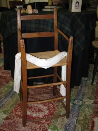 1850s wood, country made, handmade child's highchair. Woven seat, the chair is held together with pegs rather than nails. Chair has arms, but no locking mechanism or front piece. 13 3/4 inches along the side at base of chair, 15 1/2 inches wide at base. Seat measures 13 inches wide, 11 1/2 inches along the side. Highchair measures 33 1/2 inches tall, with a width of 12 inches along the highchair's seat back.Dimensions