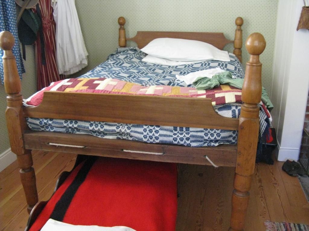 19th century "cannonball" bedstead, named for the round knobs that top the four corner posts. Came over the Oregon Trail with family, according to donor, possibly made as early as 1810. The four bedposts are 47 1/2 inches tall, and the bedframe is 21 7/8 inches from the ground. The bed itself measures 79 inches by 53 inches. The bedknobs are also known as "lemon finials" for their elongated shape.Dimensions