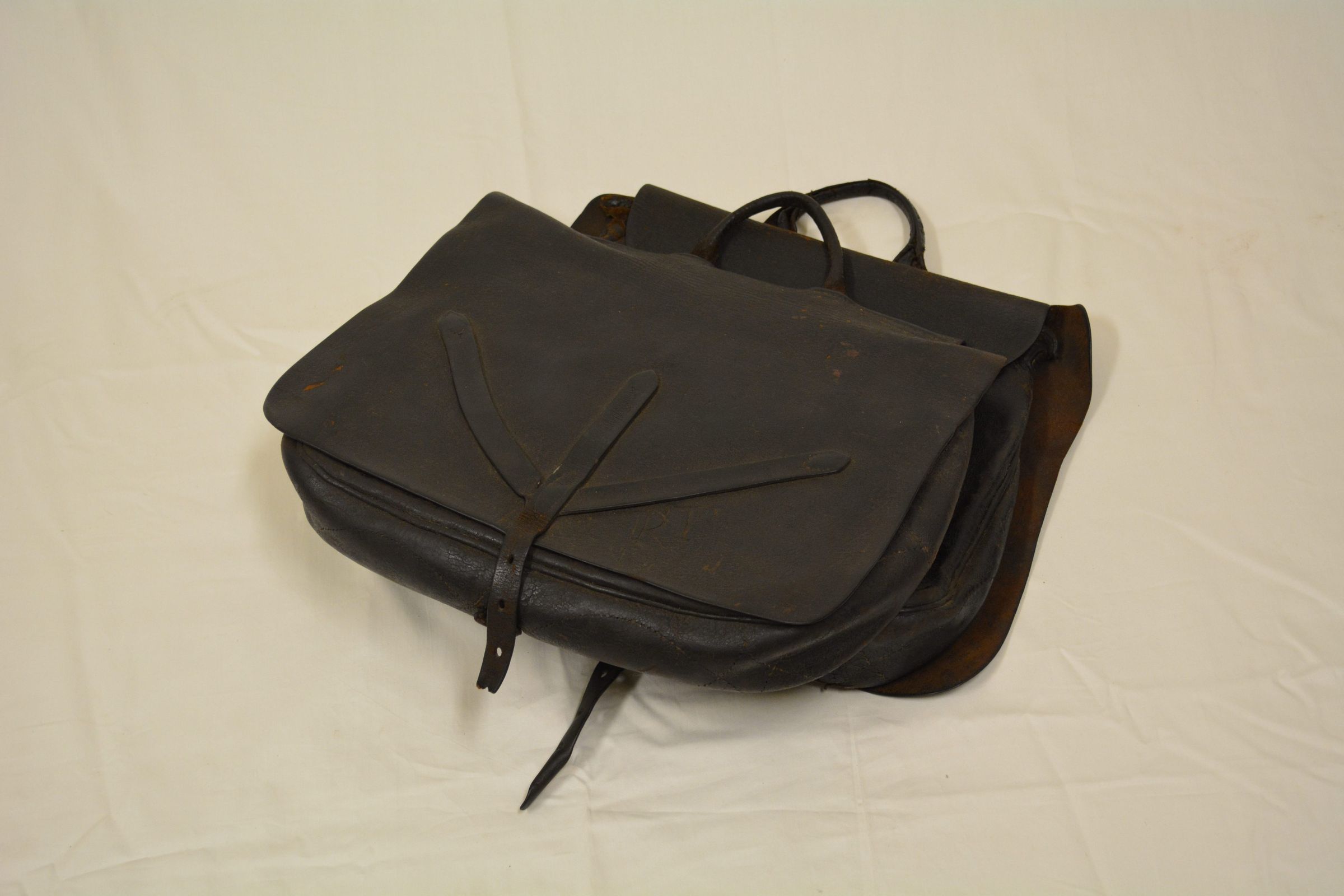 Leather saddlebag, for use on horseback. This style of saddlebag would sit behind the saddle, and would be attached with straps and ties. It represents the travel Dr. Tolmie would have had to engage in as the Chief Factor of Fort Nisqually and head of the Puget Sound Agricultural Company. Composed of two bags attached by a thick leather strap that would rest across the horse's back, each bag measures 12 inches tall, 14 inches long, and 3 1/2 inches thick.Dimensions