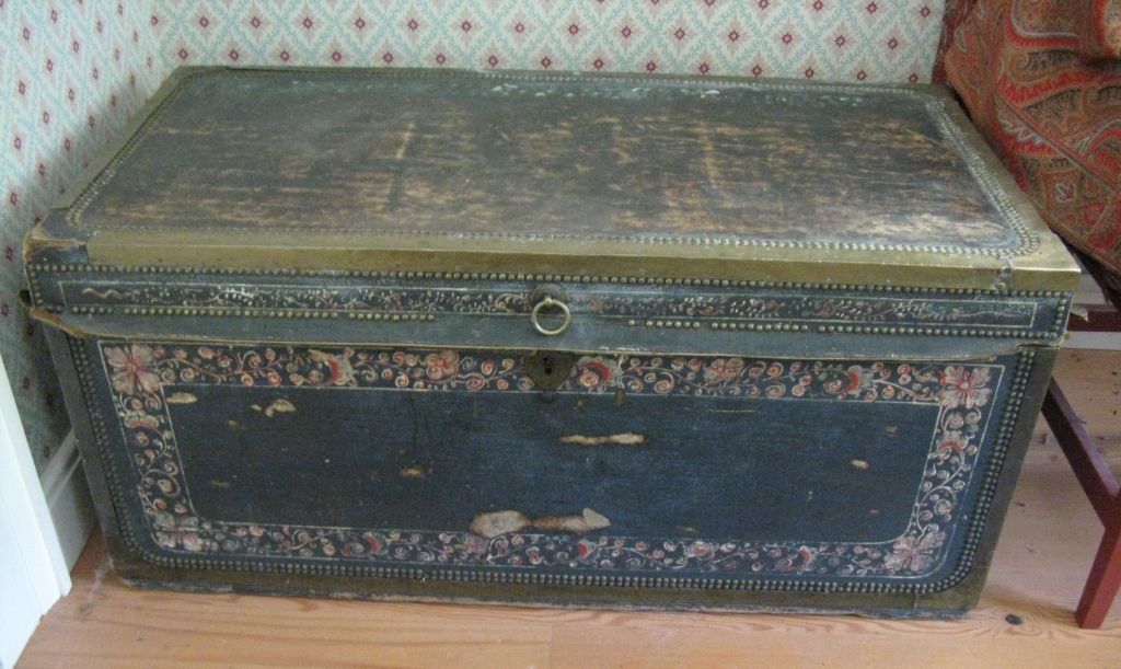 Mid-19th century Chinese trunk. Handle on either end, keyhole for locking, decorated with rounded brass rivets. Measures 41 1/2 inches wide, 21 inches long, and 19 1/4 inches tall. The trunk belonged to John Flett, an HBC employee, part of the group of Red River settlers that came over and stayed for a few weeks at Fort Nisqually in 1842, before moving on to the Willamette Valley. He returned to South Prairie (near Fort Nisqually) in 1869 to stay. Chinese trunks were a common possession for gentlemen of the company, the fact that a laborer owned one is noteworthy.Dimensions