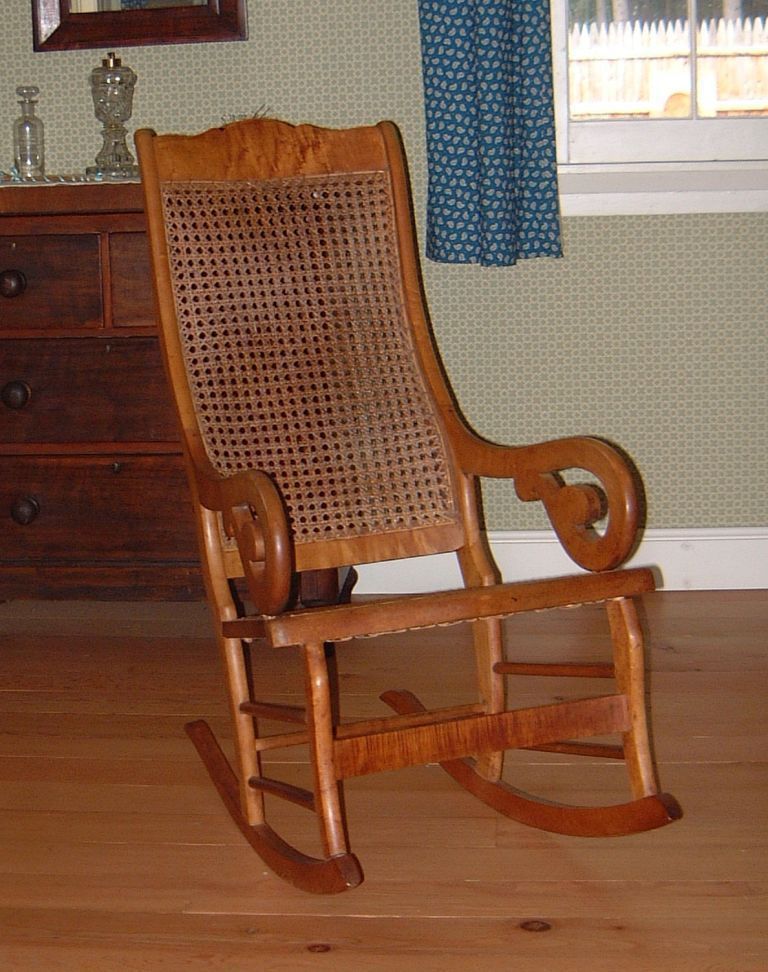 19th-century cane-seated and -backed rocking chair. Similar to the maple rocking chairs that were part of an 1854 inventory of goods from San Francisco, and is an example of a typical possession of an HBC employee, such as William Young.