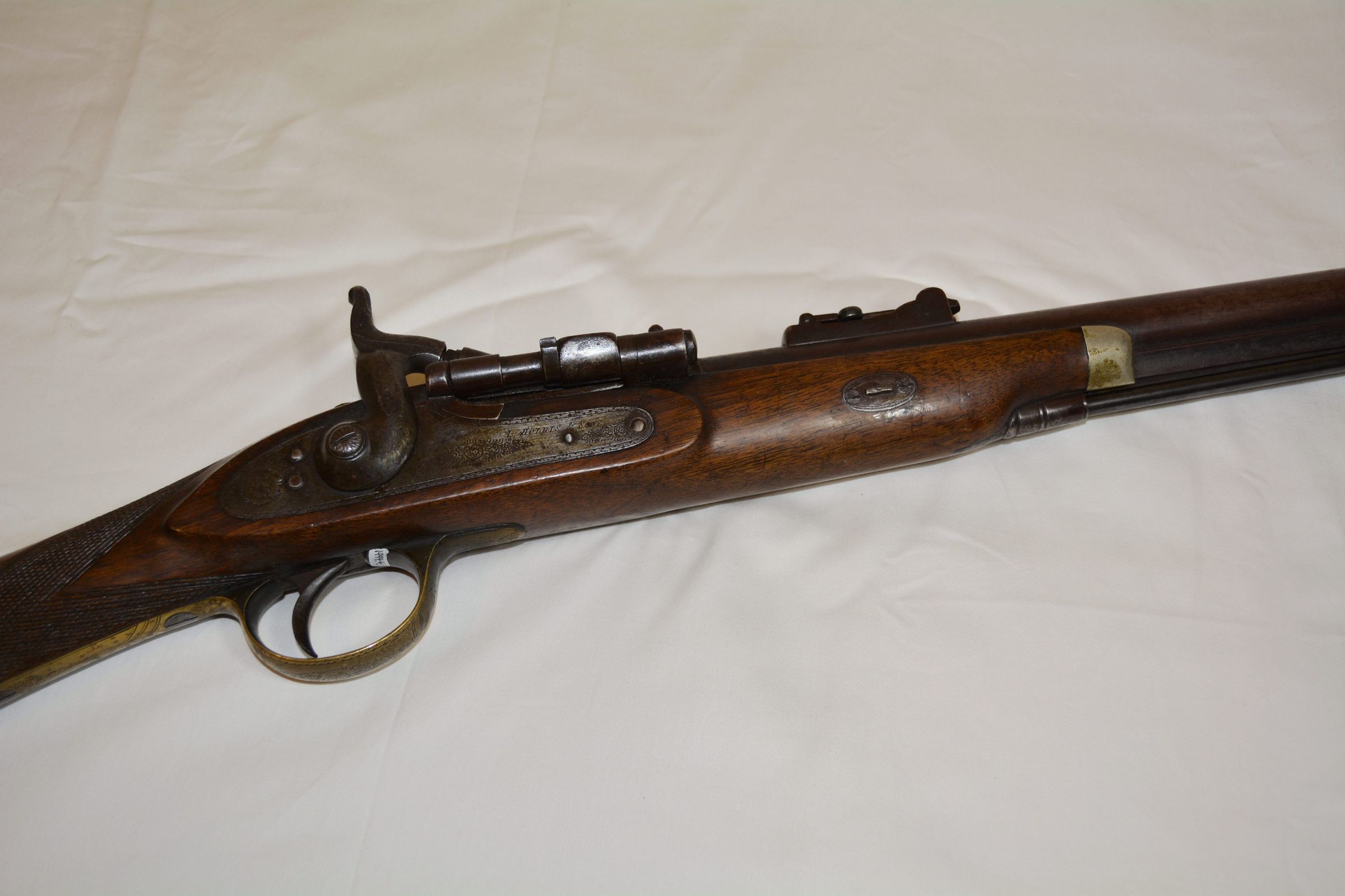 Maker's Mark: "I. Hollis and Sons, London" and "Makers to Her Majesty's War Department." Also has John Work's initials "JW" are engraved in a brass circle on the butt.