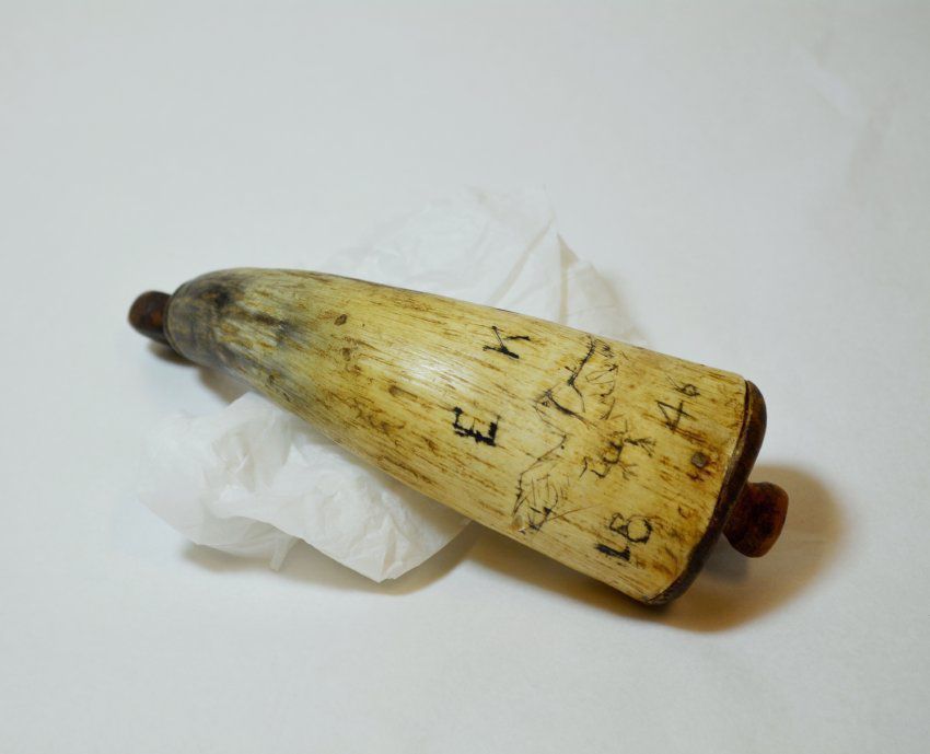 Small powder horn with crude engraving of an eagle, with "EK" above and "1846" below. Wooden plug intact, end incised for leather thong strap. Wooden stop in butt of horn nailed into place with four nails. Measures 6 inches along the outer curve, or 5 3/4 inches straight end to end. Butt end measures 1 1/2 inches tall and 1 3/4 inches wide. Plug end measures 1/2 inches wide. A horn like this was made to hold gunpowder, although cows horns have also been used to hold things such as sugar and salt due to their waterproof nature.Inscription/Signature/Marks