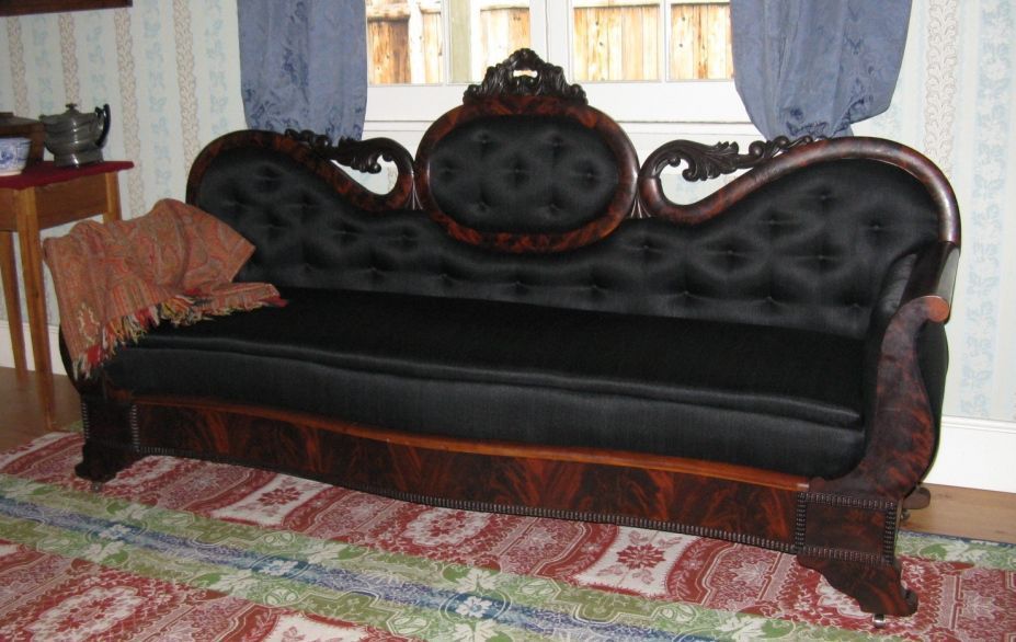 Cameo-backed sofa, mid-19th century. Four legs on casters, burl veneer. This sofa is likely similar to one purchased by Dr. Tolmie from a San Francisco merchant in 1854. Dr. Tolmie's original sofa was noted on an inventory of incoming goods August 31, 1854 as being a "Shield Back Sofa" for $28.70. Upholstery with black horsehair fabric was completed in March 2010 and the sofa is now on display in the parlor of the Factor's House. Horsehair upholstery was commonly used in middle class homes for sofas and chairs.