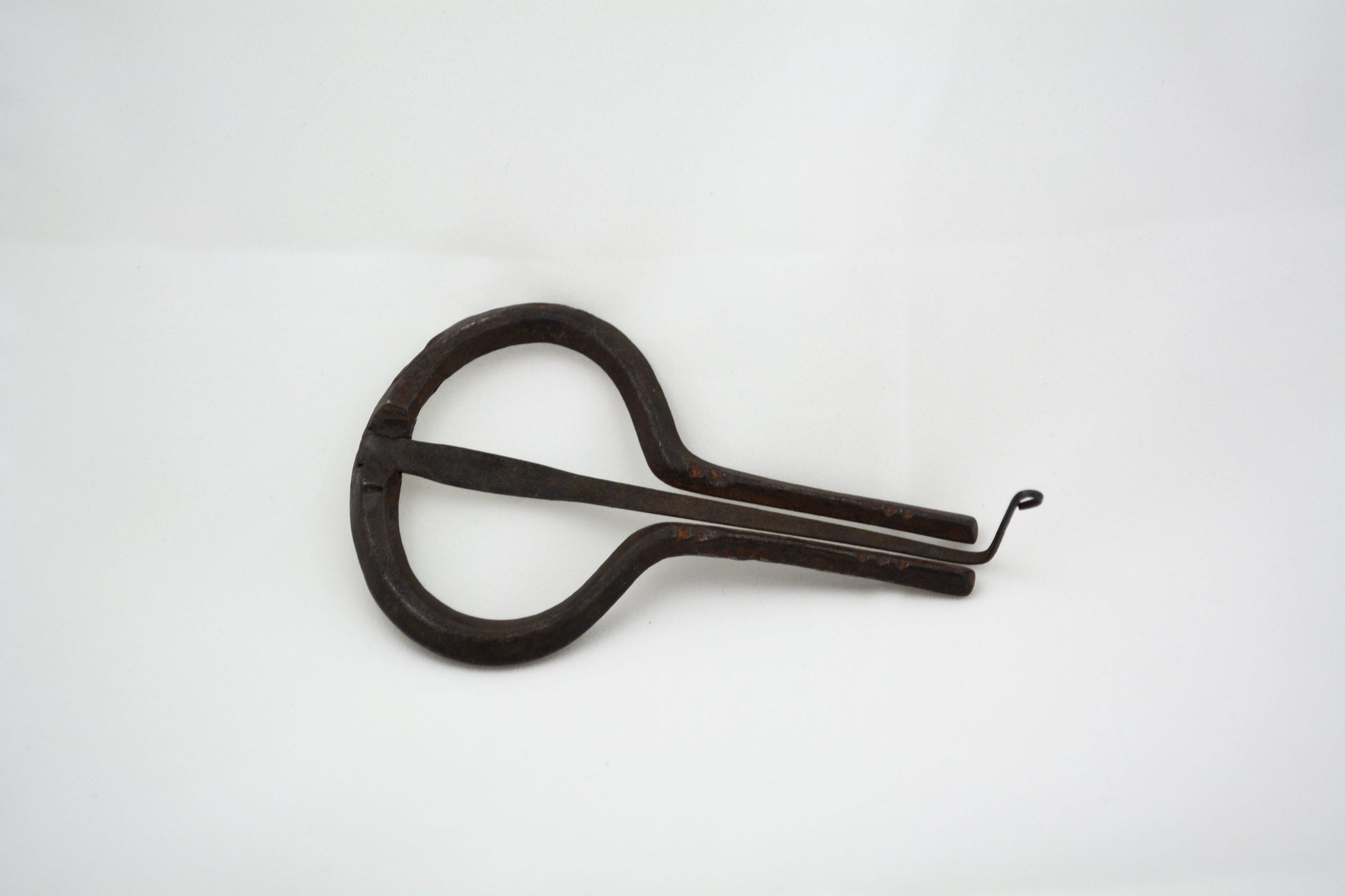 Iron jaw harp, stamped into the iron at mouth piece is "Made in England". The harp appears to be made from 1/4 inch square stock iron, although it is possible that only the thin central piece was applied by forging. Measures 4 1/8 inches in overall length, and handle is 2 1/2 inches wide at widest point. This was a common trade good, listed on several invoices of goods shipped to Fort Nisqually and available for sale in the Sale Shop. A "Jew's Harp" could provide musical entertainment in any situation, as it was small, portable, and not too difficult to learn.Inscription/Signature/Marks