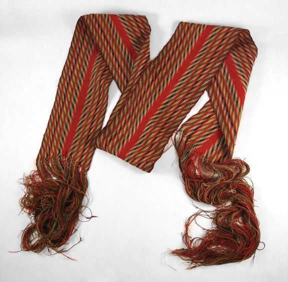 Assomption sash, "Ceinture Flechee" in French, woven in l'Assomption, near Montreal, Quebec, Canada. Also known as a Voyageur Sash because they were commonly worn by French-Canadians, Metis, and others employed in the fur trade. The sash is finger-woven, and uses the colors red, dark blue, olive green, tan, and light gold, in a pattern of arrow-head and lightning-like stripes. This sash was a common article of clothing among voyageurs, providing abdominal and back support as well as being fashionable. This sash measures 6 3/4 inches in width and 11 feet 4 inches in overall length, including fringe. The woven part is 6 feet 5 inches, and the remainder is fringe at both ends. The fringe is uneven at its ends, not blunt. The first inch of fringe is braided together. No tears, holes, or other damage at time of accession. The sash dates to c. 1840, and was authenticated by David Hansen, curator at Fort Vancouver National Historic Site.Dimensions