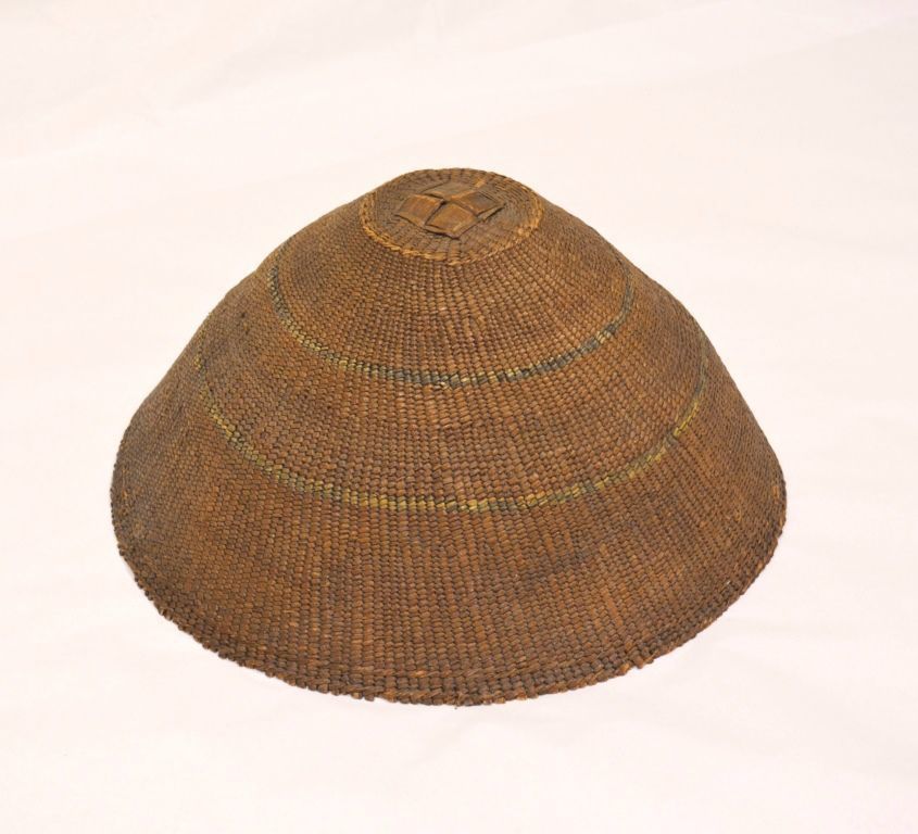 Native American cedar root woven conical hat, Salish. Band inside hat assures fit, measures 6 3/4 inches in diameter. Three slender stripes, woven in green, red, and blue, ring the hat. These stripes are placed 1 1/2 inches apart, descending from the top center. The top is flat with strips of cedar woven to form a large square with four quadrants. The top measures 3 1/4 inches in diameter, and the brim measures 12 1/4 inches in diameter. Woven in a double-layer style, with an inner layer of bark woven into the outer layer.
