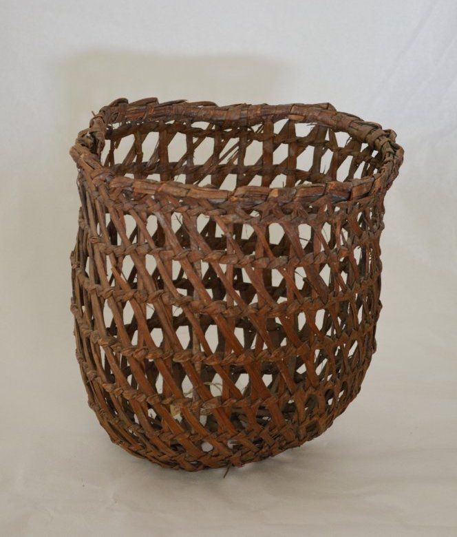 Native American Puget Sound burden basket, designed for collecting shellfish and clams. Mesh construction, dates c. 1850s and was part of the Hazard Stevens Collection (son of Washington Territorial Governor Isaac Stevens). Measures 10 inches tall, and has diameter of approximately 9 1/2 inches.Dimensions