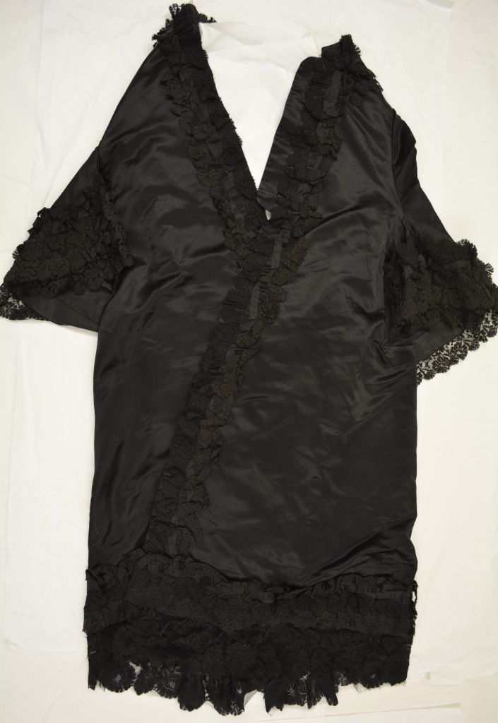 A dolman belonging to Letitia Work Huggins, donated by her descendants. A dolman is a specific type of cape-like robe, with a front opening and wide sleeves. This dolman is black, has prominent lacework, and the front has hook and eye fastenings. On each side of the dolman there are lace frills from the neck down to the hem, as well as going down the middle of the back. The trimming goes around the end of each sleeve, and there is a bow at the waist. The garment measures 51 inches long, with sleeves that are 21 1/2 inches long.