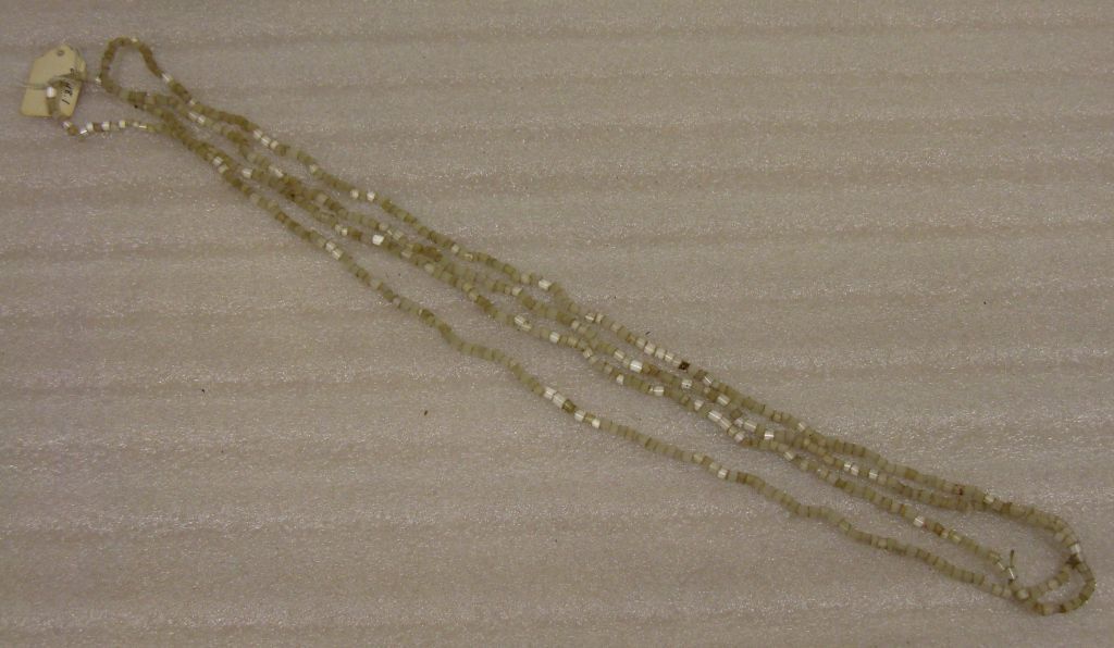 91 inch long string of trade beads, "white bugle". Each bead is quite small, measuring about 3/8 inches to 1/2 inches in length and about 3/8 inches in diameter. Authenticated by Derrel Thiel of WSHS on 9/14/1982. This style of trade bead entered the Pacific Northwest around the 1850s or 1860s, and was in use up until the 1920s.Dimensions