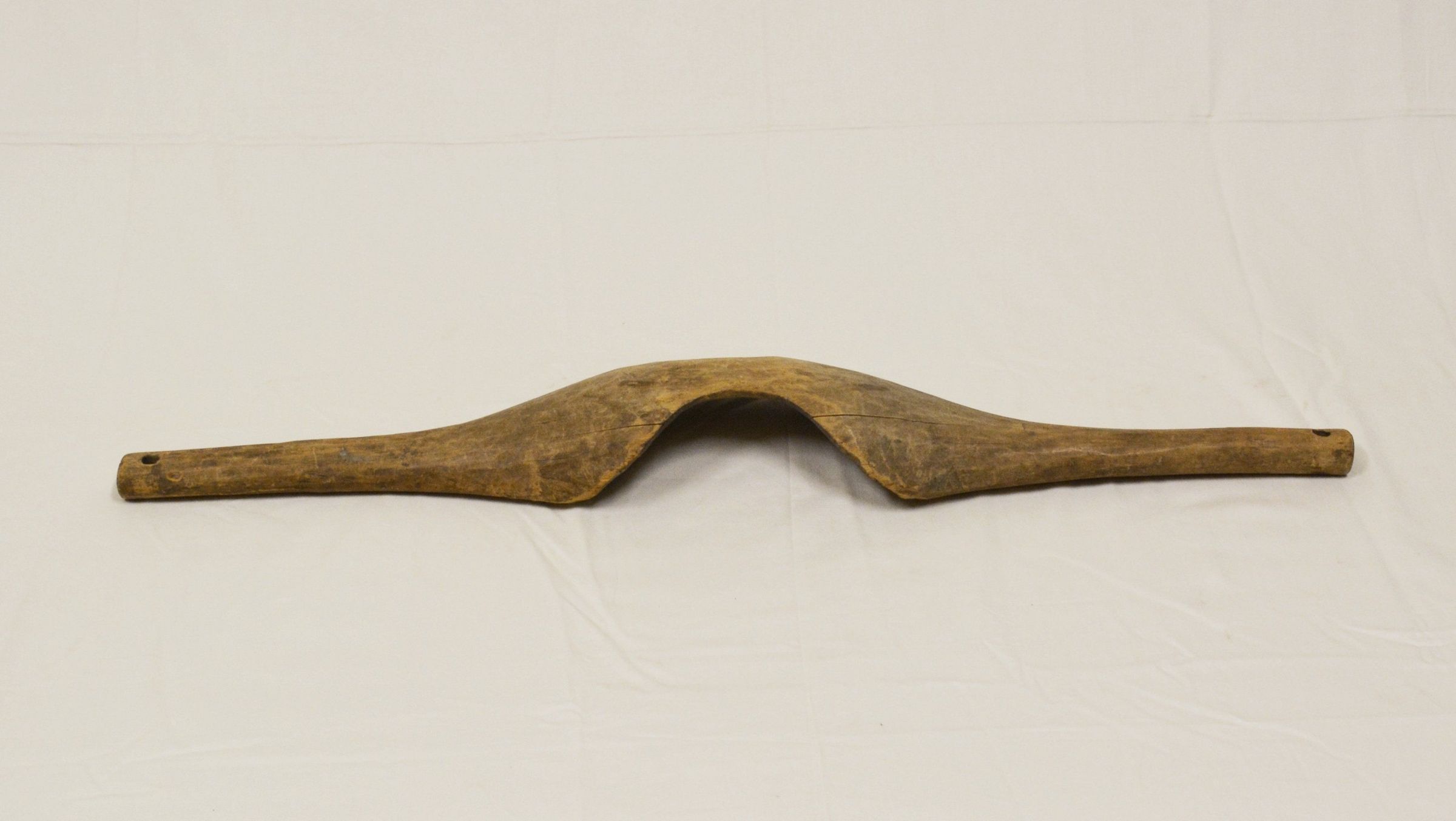 Shoulder yoke, wooden, hand-carved. The yoke is worn, but in good condition, no cracks. The holes for the ropes at either end are intact, and there's one spot of red paint on the right side near the hole. A yoke like this one would be used for manually hauling small loads such as buckets of water for home or farm use. Worn on the shoulder, two ropes would be attached to the ends of the yoke, with a hook on the end of each rope to fasten to the load. The donor is unknown, but a note written directly on the wood of the interior says "Yoke made 50 years ago by John Frederick of Gig Harbor, WA." The yoke measures 35 1/4 inches long end to end, and 5 3/4 inches wide at the neck indent. It stands 2 3/4 inches tall at the indent as well.Inscription/Signature/Marks