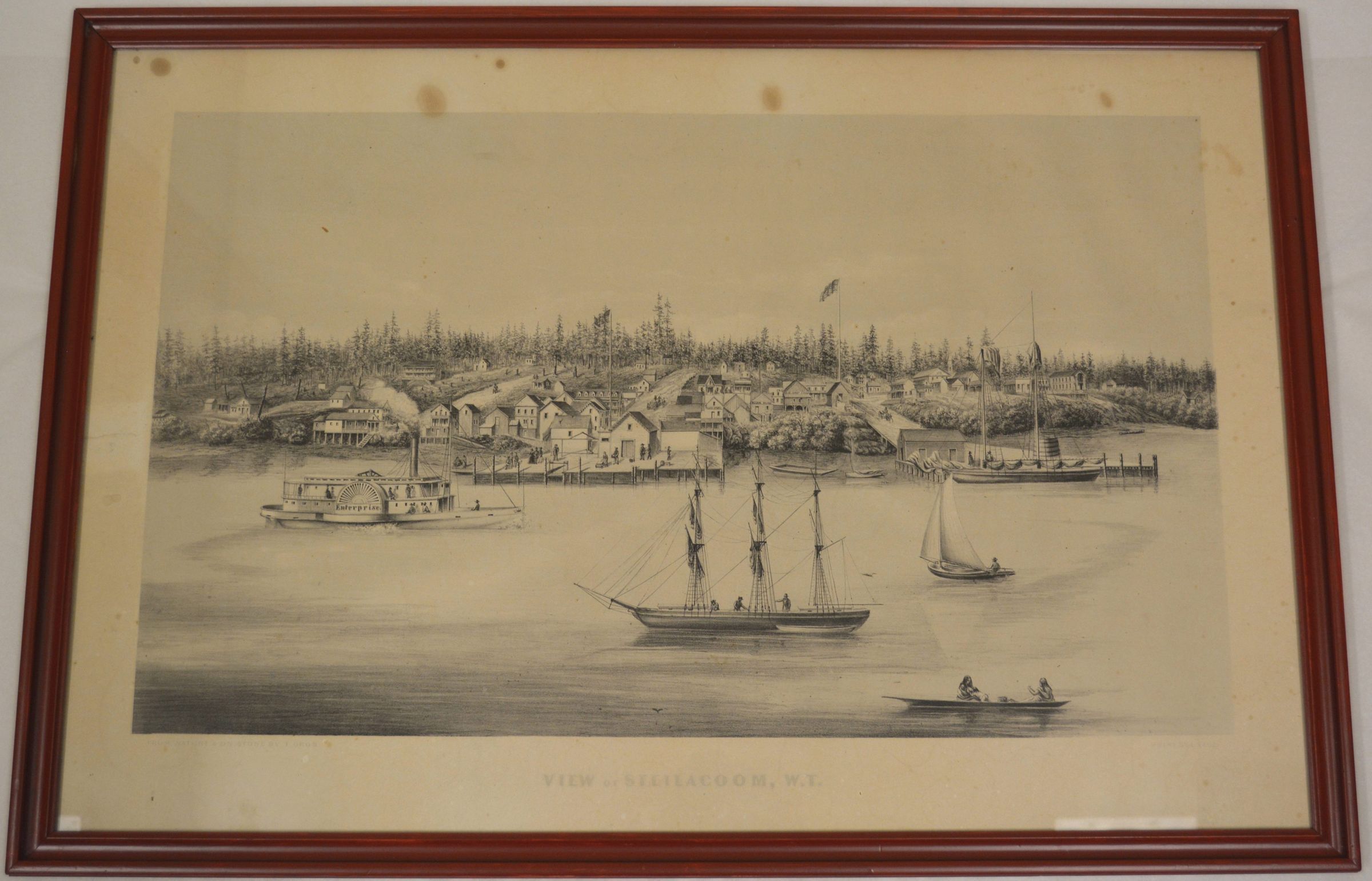 Original art print of Steilacoom, Washington Territory, dated to 1858. The print depicts Steilacoom harbor, with the Hudson Bay Company's steamship Enterprise prominently featured, alongside several sailing ships and a native canoe with three figures, two adults and a child, inside. The town is set against a wooded hillside, with the buildings set farther apart up the hill and on either side of the town center. Depicts the docks, complete with warehouses. Some of the buildings in the town are labeled, "Livery Stable", "Billiard Saloon", "Keach Store","Steilacoom Hotel", and two American flags can be seen flying from various parts of town. The picture is identified as "View of Steilacoom, W.T.", "From Nature & On Stone by T. Grob", "Print by L. Nagel." The bustle worn by one of the Enterprise's passengers suggests a date c.1860. Original accession records date the picture to 1858. Framed after accession, wood, painted red. Measures 21 1/2 inches by 31 1/2 inches with frame, 20 inches by 30 inches without frame. Steilacoom was formally incorporated as a town in March 1854, combining Port Steilacoom and Steilacoom City, both settlements founded in 1851. Steilacoom had a population of about 500 by 1860.Inscription/Signature/Marks