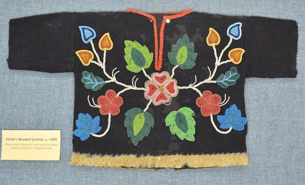 Child's beaded jacket, c.1850. The jacket is made of dyed "sawtooth" trade wool and is possibly of Ojibwa or Chippewa origin. The jacket is dark blue with floral designs picked out in beads. Measures 14 inches wide across lower hem, and 25 inches wide across the top and including the sleeves. The sleeves themselves are 5 inches wide at the ends, and the side from lower hem to arm is 12 inches on the right side and 12 1/2 inches on the left side. It has had extensive conservation and restoration to preserve it for future exhibits. Although the Ojibwa tribe is from the Great Lakes regions of North America, Native Americans employed by the Hudson's Bay Company sometimes traveled west with the HBC fur trade companies, and remained to work at fur trading posts like Fort Nisqually.
