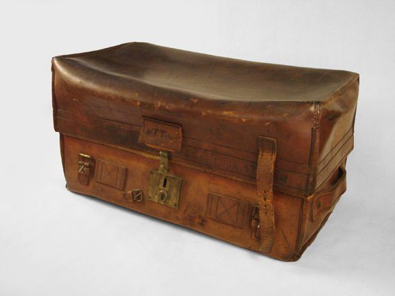 A leather trunk, valise, or suitcase, used by Dr. William Fraser Tolmie and bearing his initials "W.F. Tolmie" on the front leather flap above the brass latch and keyhole. A strip of leather riveted along the back of the trunk forms the hinge, now broken, side handles are intact, however, and measure 9 inches long and 1 3/4 inches wide. Missing one leather strap on front, interior in fairly good condition, lined with narrow striped blue and white ticking fabric. Inside the lid there is a center divider that folds down, with a red leather pocket attached; 9 1/2 inches long by 6 1/2 inches, closed by a flap and two straps. Also, red cotton twill tape is tacked down across the underside of the divider in a diamond pattern. On the bottom of the case is a paper label glued to lining that reads: "Manufactory, Smiths Buildings, Leadenhall Street. Wine & Beer Cases of All Sizes" in the upper corners, but the main text reads: "Henry Pound & Son, Trunk, Chest, Box and Packing Case Manufacturers. Cases Lined with Tin, Zinc, & Copper, 81 & 82 Leadenhall Street, Three doors from Cree Church, London." For more information about the manufacturer, see Notes. "540" is written in white on the back hinge line. Trunk measures 23 3/4 inches wide across the front, 12 1/4 inches along the side, and stands 12 7/8 inches tall.Dimensions
