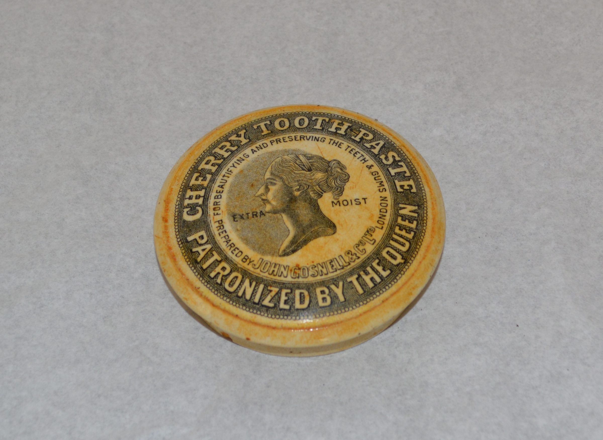 Toothpaste pot, lid only. Earthenware, yellowed with age. Transfer print label on top depicts a profile of the young Queen Victoria, and the text reads "Cherry Toothpaste, Patronized by the Queen, For Beautifying and Preserving the Teeth & Gums, Prepared by John Gosnell & Co. Ltd., London, Extra Moist". Some crazing, small chip on underside. This brand is documented in the archaeological reports of Fort Vancouver National Historic Site. A lid like this one was uncovered during excavations of that HBC fort. Measures 3 1/8 inches in diameter across the top, and 1 inch thick.Inscription/Signature/Marks
