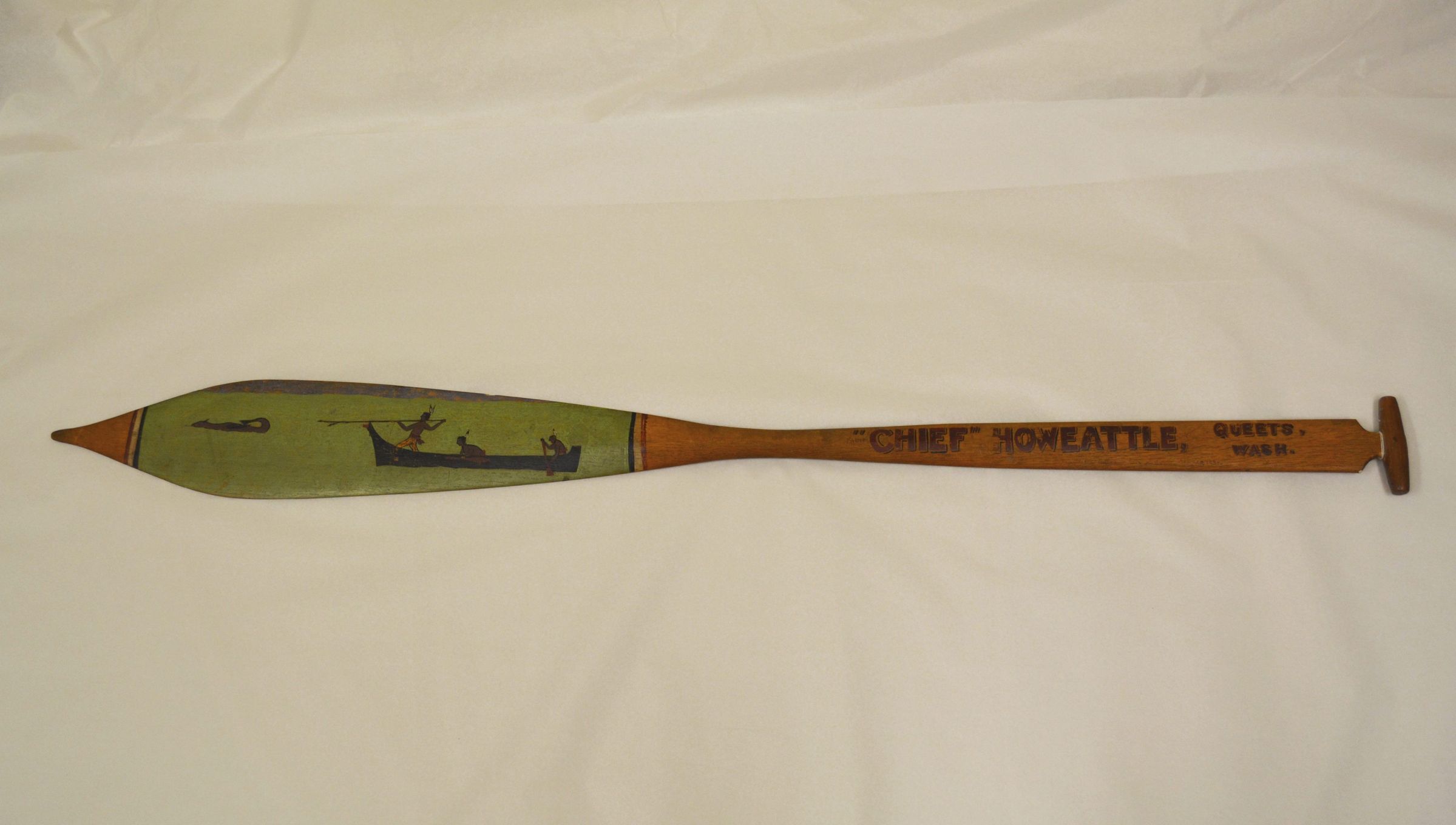 Souvenir canoe paddle, one side decorated with a painting of Native American figures out on a canoe hunting a sea creature. It also has the words ""Chief" Howeattle, Queets, Wash." and "Presented to Arthur A. Cook on Sunday, May 20, 1934". At the time Arthur Cook was the Secretary of the Young Man's Business Club, the group behind the Point Defiance restoration of Fort Nisqually in the 1930s. It was given to Mr.Cook in 1934 as a commemorative gift in recognition of his work in preserving the history of Fort Nisqually. The paddle is similar in style to those used by Salish tribes on Puget Sound, with separate handle piece and pointed tip. The paddle appears to be made of oak, and the other side is unadorned. Measures 51 inches long, 4 3/4 inches wide at widest part of blade, and 2 inches wide at largest part of the handle.