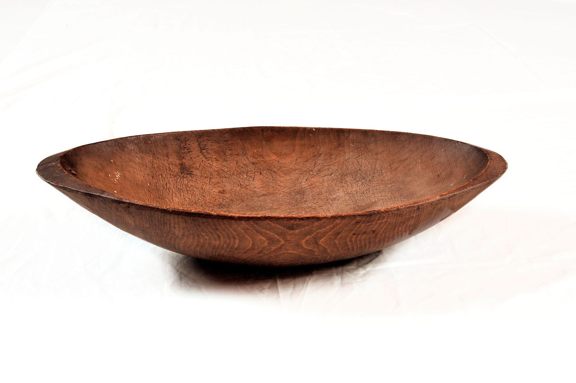 Wooden chopping bowl for food preparation. It is oblong in shape, with a gradual slope toward the deep center of the bowl. Cut marks on the inside indicate heavy use. The hole on one end is likely for hanging on a nail, a slight crack above that hole is the only crack in the bowl. No other significant cracks, chips, or checks in the wood. This bowl was used by the Huggins family while living in the Factor's House at Fort Nisqually from the 1860s-1906, after the Hudson's Bay Company had left. The cooking was done in a detached kitchen building. The bowl measures 22 inches long by 12 inches wide, and measures 4 1/2 inches deep.Dimensions