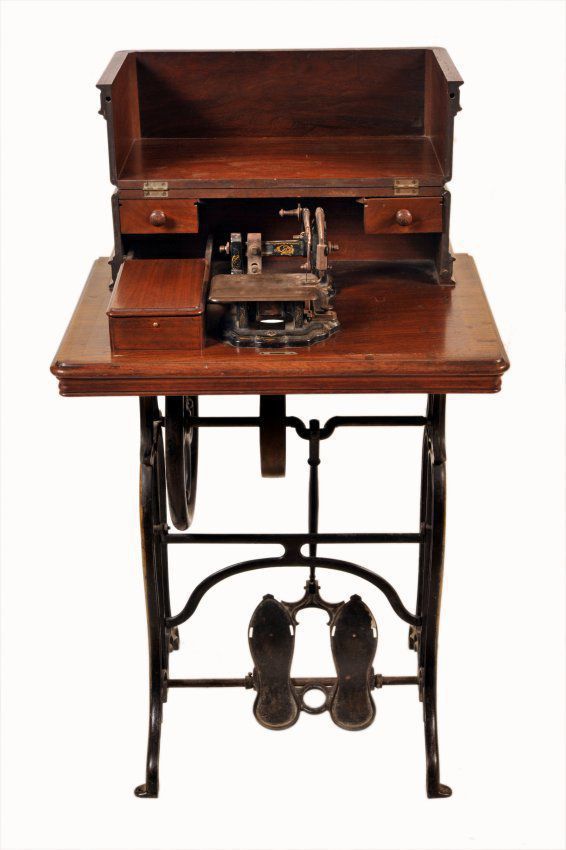Wheeler and Wilson sewing machine, 1852 model. Machine has 2 drawers, a case covering the sewing machine attached to the base, and inoperative foot pedals. One of the two drawers has a partially broken track, open with care. Serial number: 602259. The sewing machine was used in the Factor's House by the Huggins family during their time at the Fort, 1859-1906. Edward Huggins purchased this sewing machine from Charles Prosch of Steilacoom, publisher of the "Puget Sound Herald", according to a receipt dated May 15th, 1862, found near the end of Roll #1 of the microfilm "Nisqually Papers". This sewing machine measures 29 inches tall to top of sewing table, and 35 3/4 inches tall including cover. Table is 25 1/2 inches wide across the front, and 20 1/4 inches along the side. The foot pedal measures 11 1/4 inches long.Dimensions