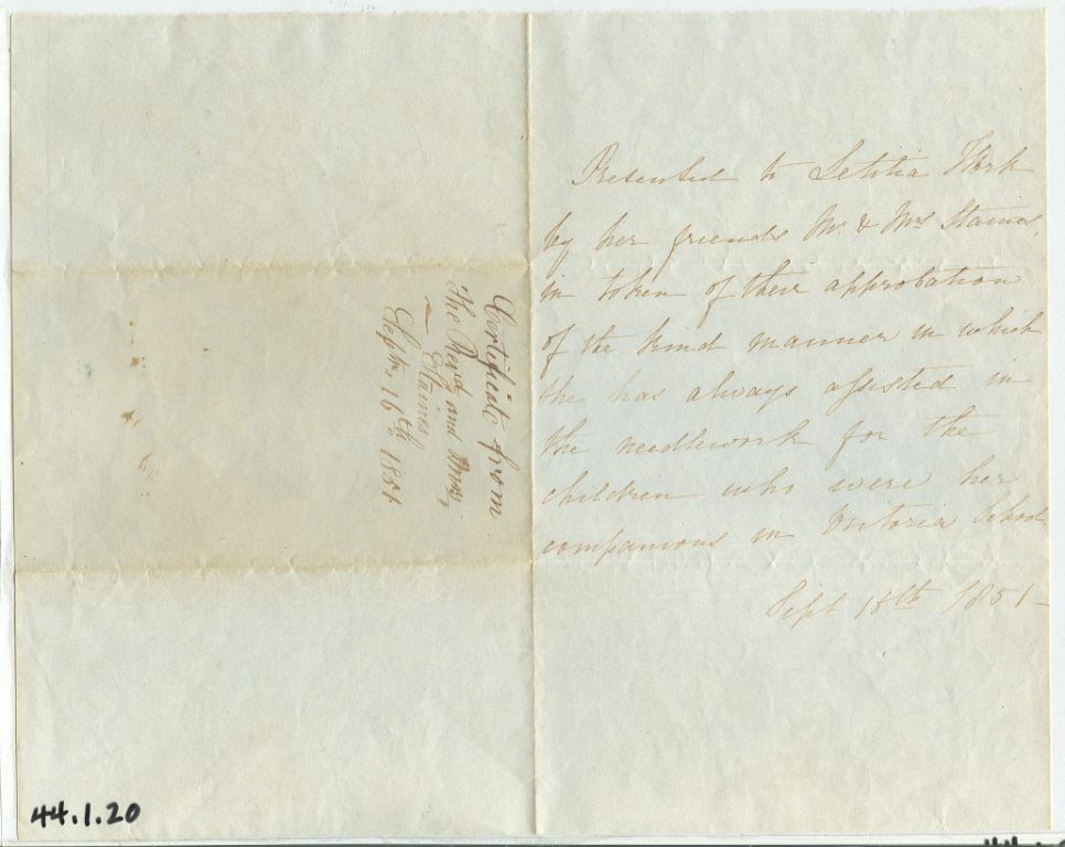 Certificate or letter of appreciation to Letitia Work (later Huggins) by the Reverend and Mrs. Stains, dated Sept. 16, 1851. The letter reads "Presented to Letitia Work by her friends Mr. & Mrs. Staines in token of their appreciation of the kind manner in which she has always assisted in the needlework for the children who were her companions in Victoria School, Sept 16th 1851". The paper was originally folded in half and then in thirds, forming it's own envelope, and on what would have been the outside is the inscription "Certificate from the Revd and Mrs. Staines, Sept. 16th, 1851. The whole sheet of paper measures 10 inches wide by 8 inches tall. Victoria School refers to the boarding school the Staines set up for the children of the Hudson Bay Company officers at Fort Victoria, British Columbia.