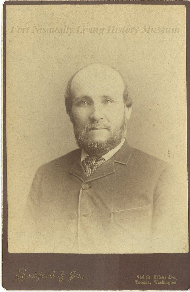 Original photographic print on cardboard, a portrait of Edward Huggins, no date. The photo is from the shoulders up. Huggins is wearing a button-up jacket, with the top button done and the rest undone, there is a pocket on the left-hand side, and he is wearing a checked cravat. He has a neatly trimmed beard, and is balding. The picture was taken at Scotford & Co., 744 St. Helena Ave., Tacoma, Washington. It does not have a date on it, but research has narrowed it down to c. 1875. The picture (including cardboard backing) measures 4 1/4 inches wide by 6 3/8 inches tall.Dimensions