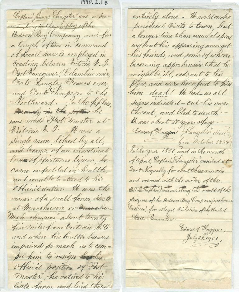 " Captain 'James Sangster'; was a sea-man long in the employ of the Hudson Bay Company, and for a length of time in command of small vessels employed in coasting between Victoria, V.I., Fort Vancouver, Columbia river, Forts Langley Frasers river and Fort Simpson to the Northward. In the fifties (several crossed out words) he was made Post Master at Victoria V.I. He was a single man, liked by all, and because of an inordinate love of spiritous liquor, he became enfeebled in health, and unable to attend to his official duties. He was the owner of a small farm, situated at Munchausen or 'Mah-chusun' about twenty five miles from Victoria B.C., and when his health became impaired so much as to compel him to resign his official position of Post Master, he returned to his little farm and lived there entirely alone. he would make periodical visits to town, but a longer time than usual elapsed without his appearing amongst his friends, and some of whom becoming apprehensive that he might be ill, rode out to his place, and were horrified to find him dead! He had- as all signs indicated- cut his own throat, and bled to death. He was about 50 years of age.