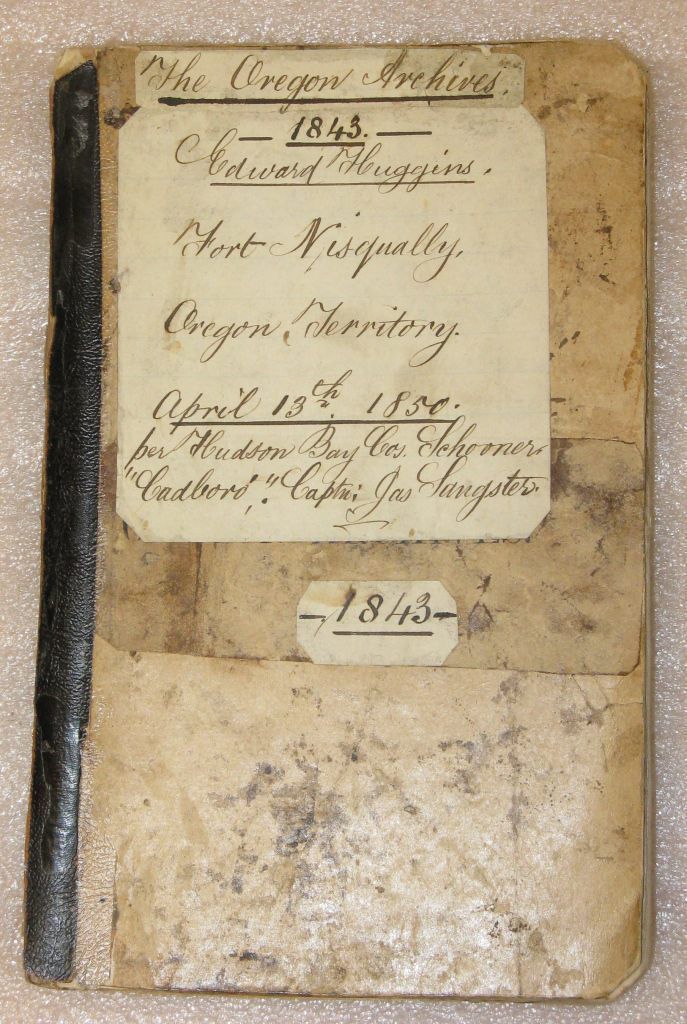 Book, "The Oregon Archives', 1843. The book has lots its original cover and binding, and now sits between two makeshift covers where are coming apart. Both front and back covers have homemade labels in Edward Huggins' handwriting, they read "The Oregon Archives, 1843, Edward Huggins, Fort Nisqually, Oregon Territory, April 13th, 1850, per Hudson Bay Cos. Schooner "Cadboro", Captain: Jas Sangster. 1843". On the bottom edge of the book, across the pages, is written "Archives of Oregon 43". Inside the back cover is "Huggins, Steilacoom, Wash." but it off center and the first few letters of "Steilacoom" are missing and the writing is upside down, indicating it was cut from a larger piece of card board. The book itself is 328 pages long, consisting of printed letters and meeting minutes, notes, and reports dealing with Oregon Territory from Feb. 17, 1841 through Dec. 1, 1848. The preface at the beginning of the book is signed "L.F.G." of Salem, Oregon Territory, September 1853.