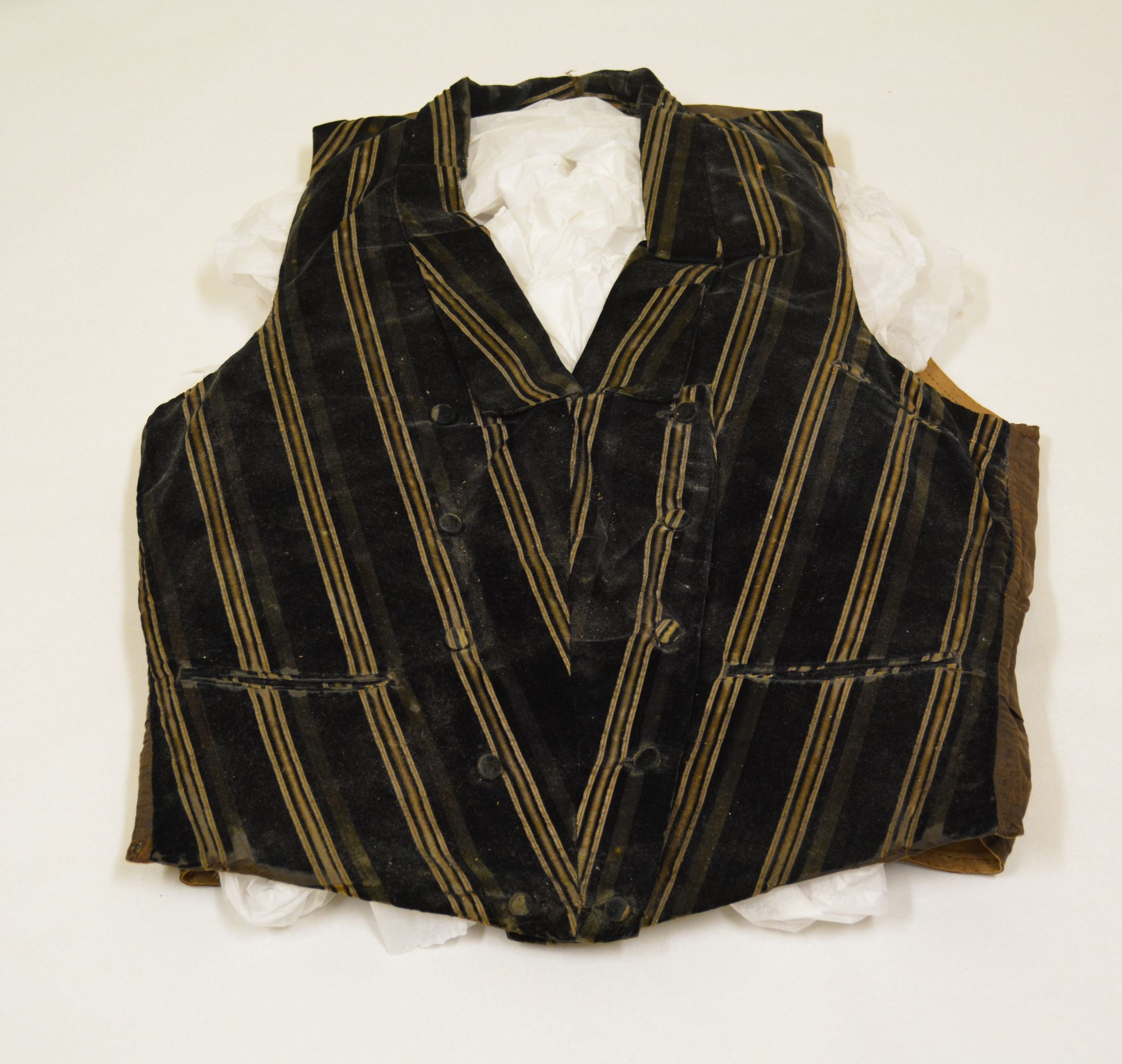 A man's formal vest. Fabric is dark green velvet with light green and light brown stripes, angled to form a "v" shape across the front of the vest. Double-breasted style, all ten fabric-covered buttons are present. with three pockets total, one on each side at the waist and then one up near the arm hole on the left side. The vest is lined with a light brown fabric. According to donor, the item was worn by a Gideon Stiles on the occasion of his wedding, c.1860. The vest measures 22 1/4 inches long and 18 1/4 inches wide across the middle.Dimensions