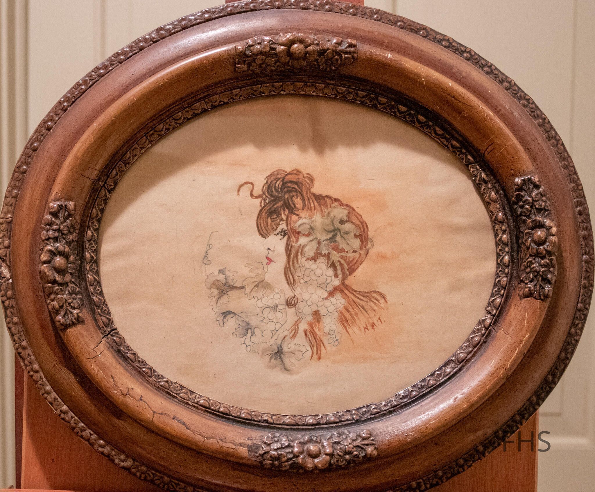 A drawing/watercolor painting displayed in an antique frame. This drawing was drawn by Nell Trowbridge and given to Ford Clark. Mrs. Clark gave it to Virginia Tarr who later donated it to Fowler Historical Society.Cataloged By