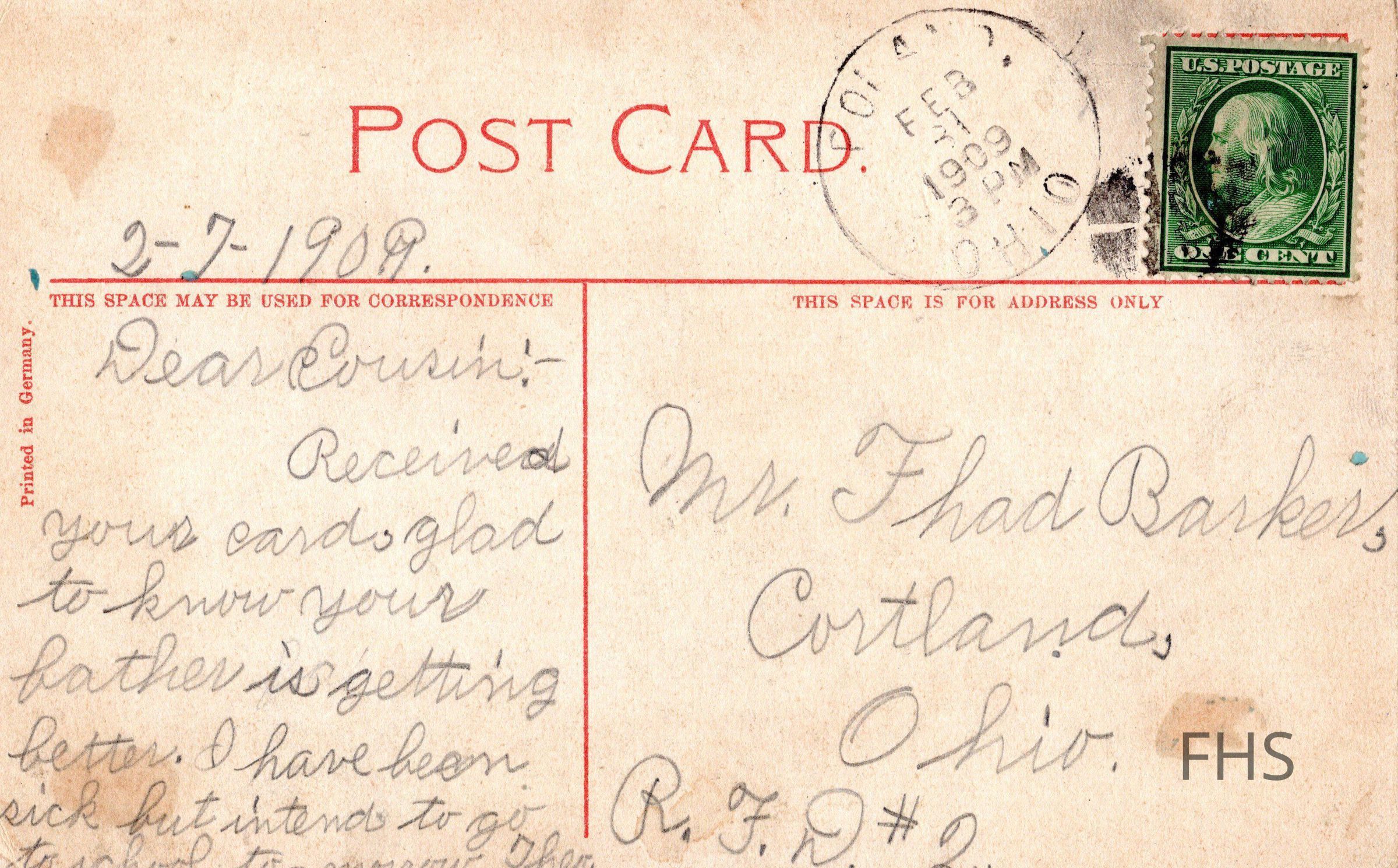 A Baltimore and Ohio Depot postcard sent to Thad Barker by Theo in 1909.Cataloged By