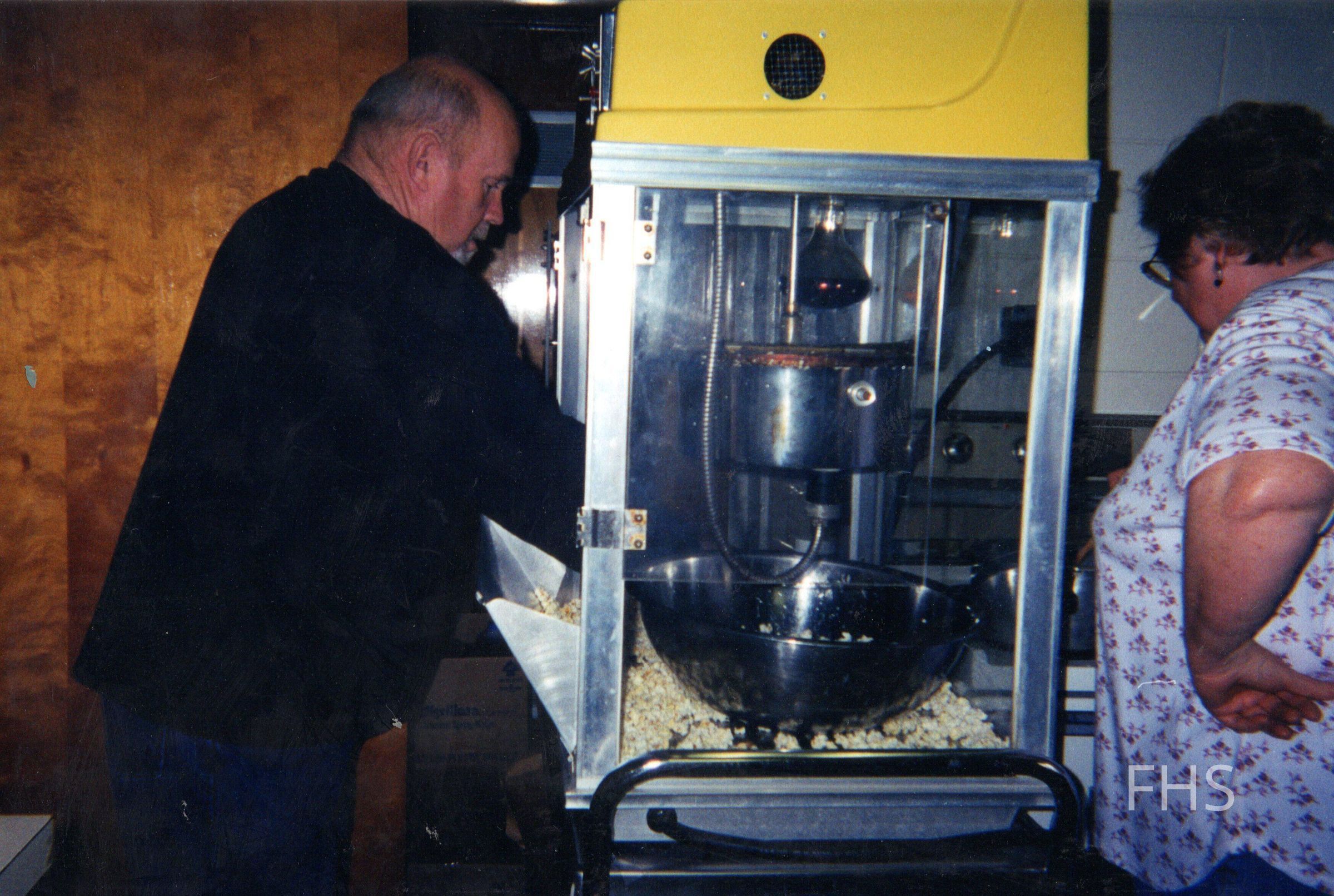 Margie Rising and Tom McDonald making popcorn for an event.Cataloged By