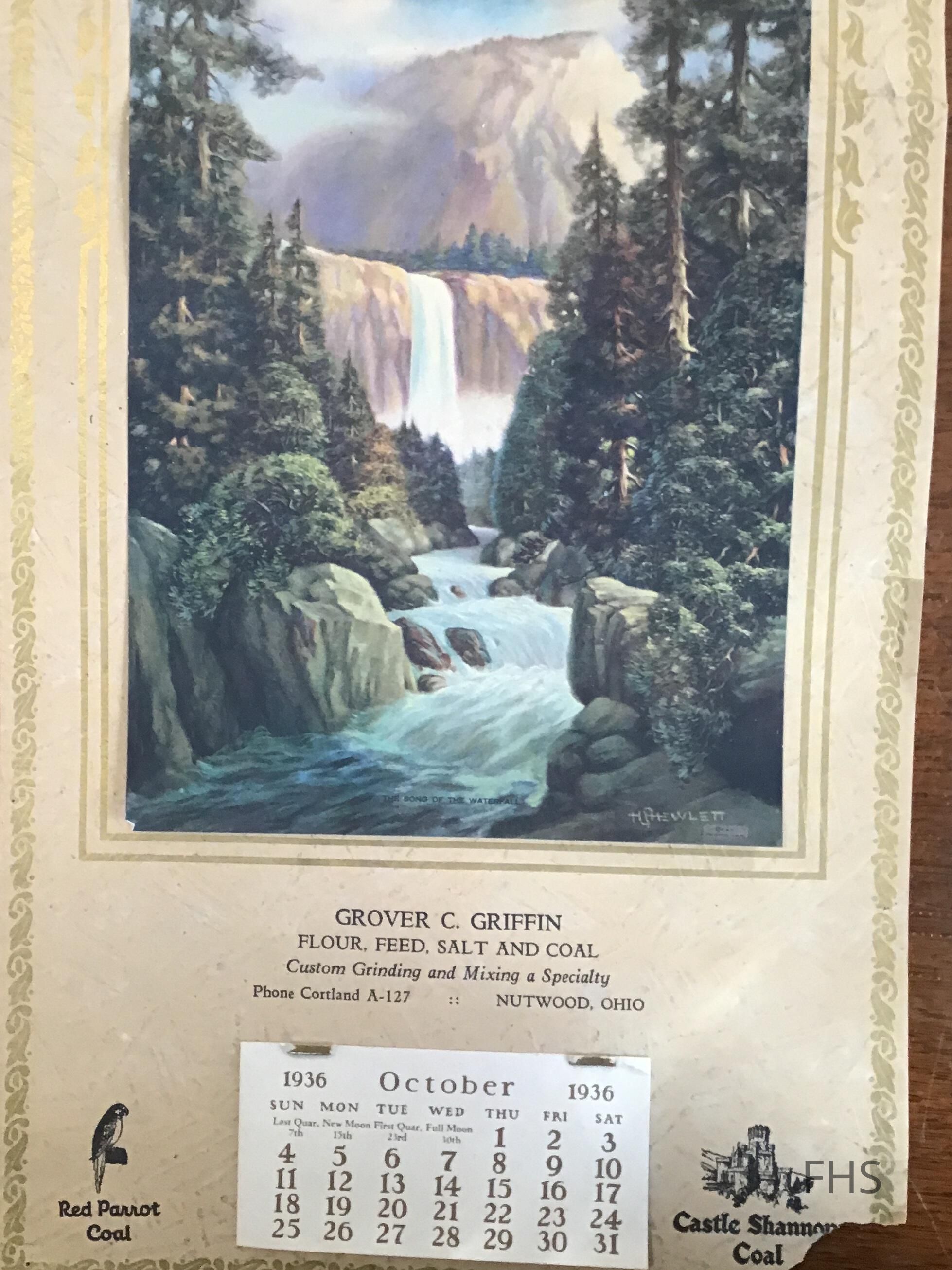 A complimentary calendar from 1936 with Grover C. Griffin Flour, Feed, Salt and Coal company, located in Nutwood, Ohio.Cataloged By