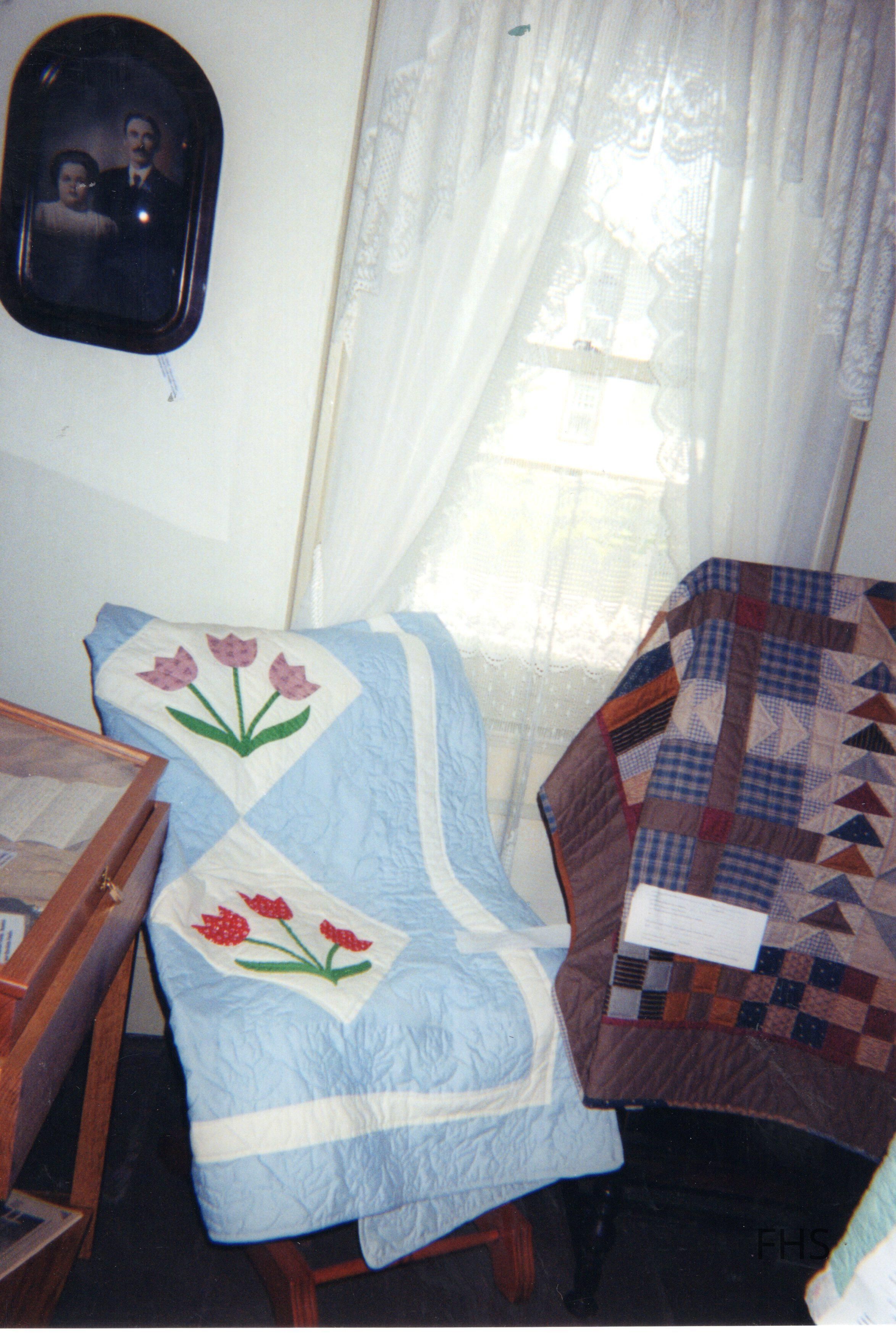 A photograph of a temporary display of quilts at the Butts Museum by the Fowler Historical Society.Cataloged By