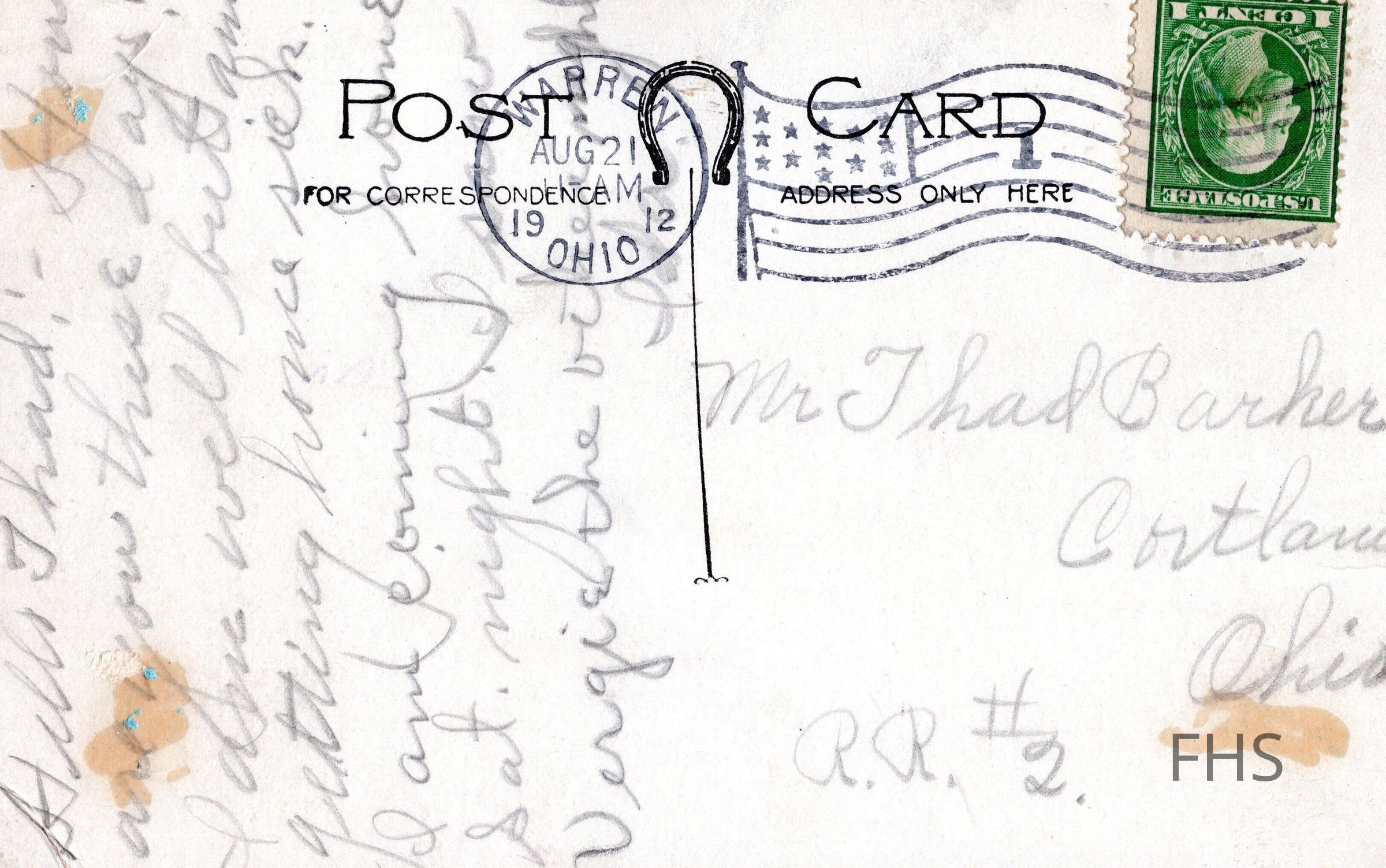 A Warren, Ohio postcard sent to Thad Barker by Ida in 1912.Cataloged By