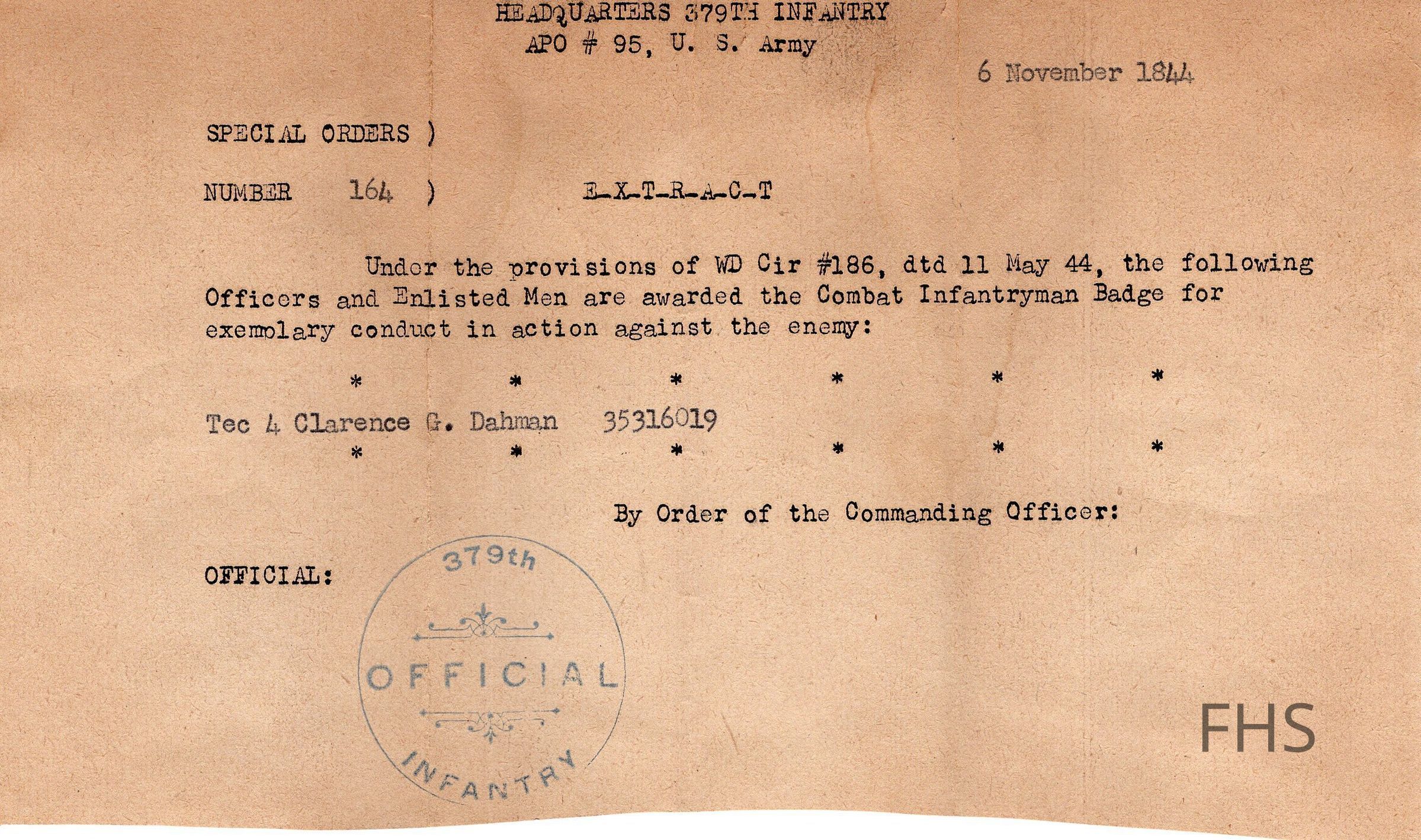 An official order from the Headquarters of the 379th Infantry, APO # 95, U.S. Army awarding “the Combat Infantryman Badge for exemplary conduct in action against the enemy” on May 11, 1944 to Clarence G. Dahman.Acquisition