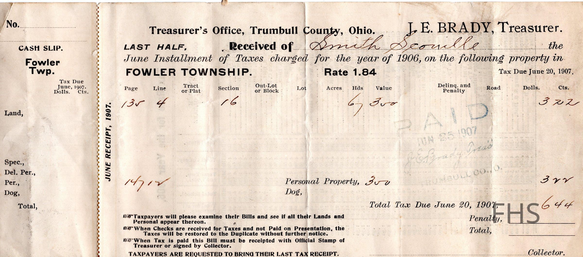 A receipt for partial payment of property taxes from Smith Scoville to the Trumbull County Treasurer, J. E. Brady for the year 1906 paid in 1907.Cataloged By