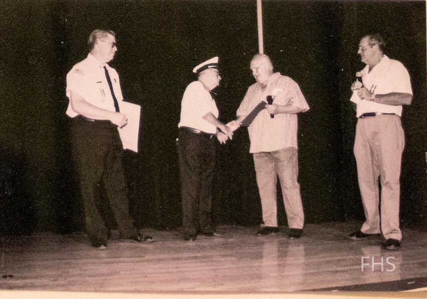 A photo of the Fire Chief Fred Yungbluth, Retired Chief Robert McDonald, Township Trustee Jim Haun, and MC Dave Cover taken at the Fowler Bicenntennial in 1999.