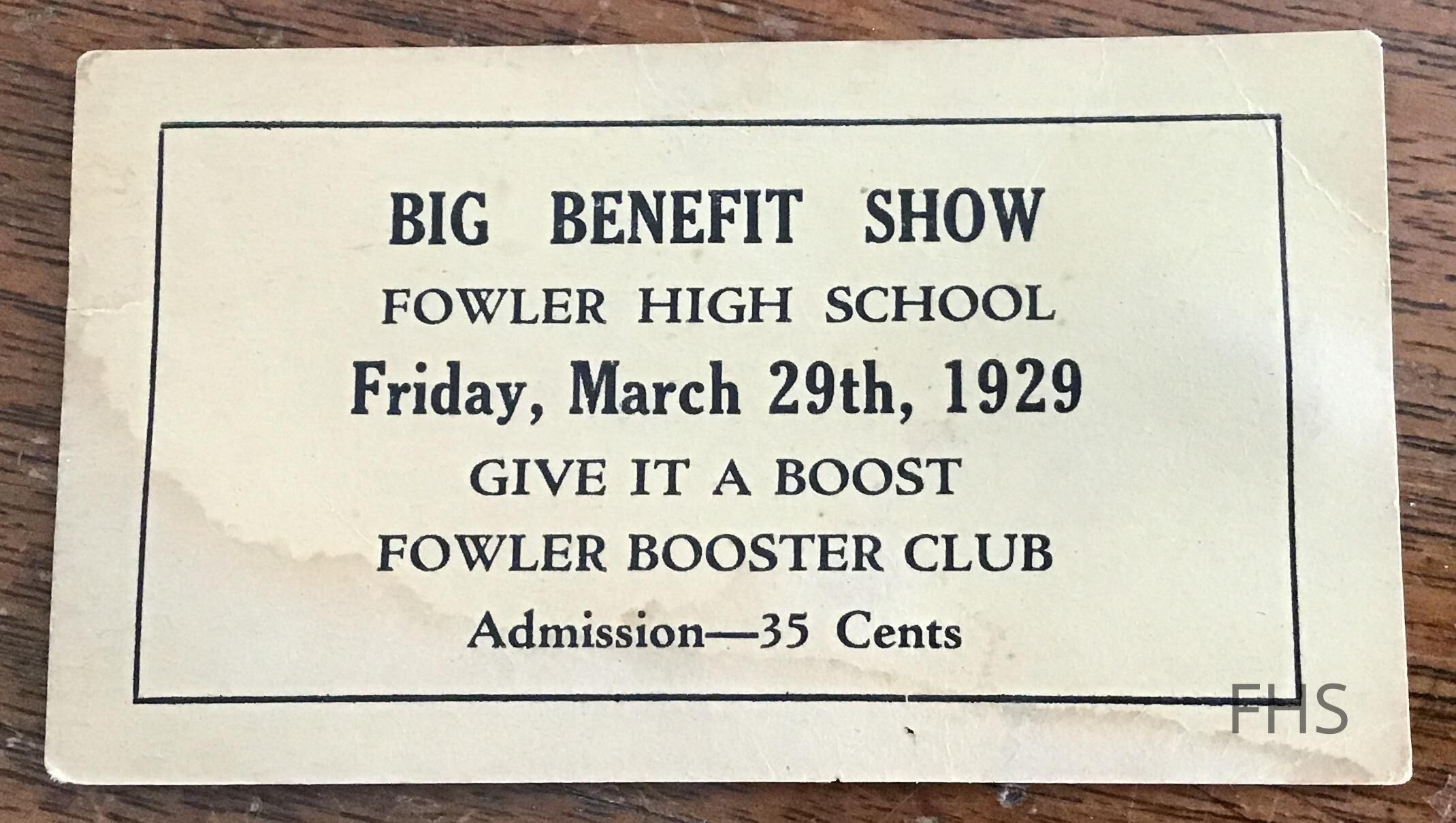 An admission ticket for a benefit for the Fowler High School booster club at the cost of 35 cents dated March 29, 1929.