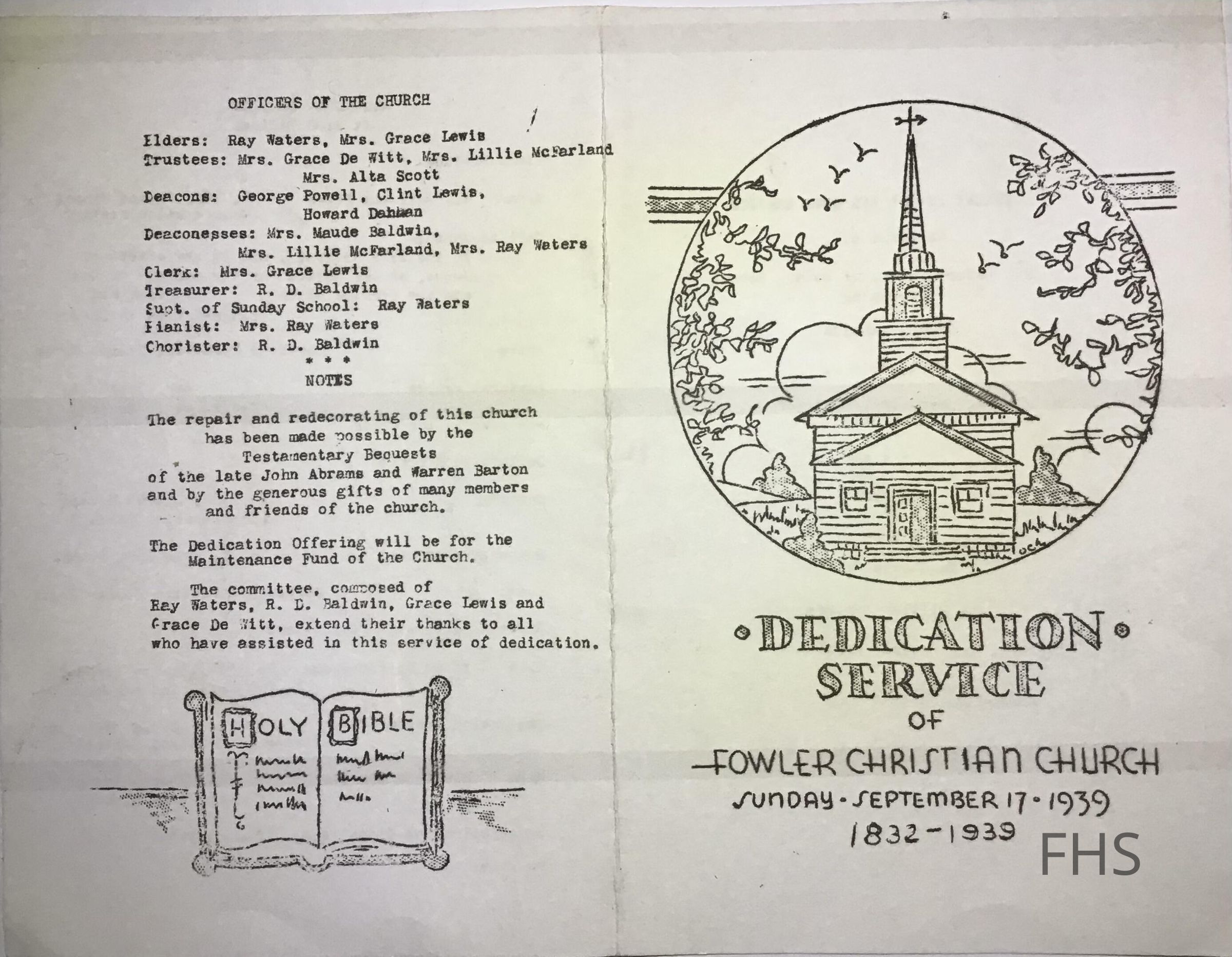 Fowler Christian Church, Waters, Ray, Lewis, Grace, DeWitt, Grace, McFarland, Lillie, Scott, Alda Smith, Powell, George, Lewis, Clint, Dahmen, Howard, Baldwin, Maude, Waters, Mrs. Ray, Baldwin, R. D., Abrams, John, Barton, Warren